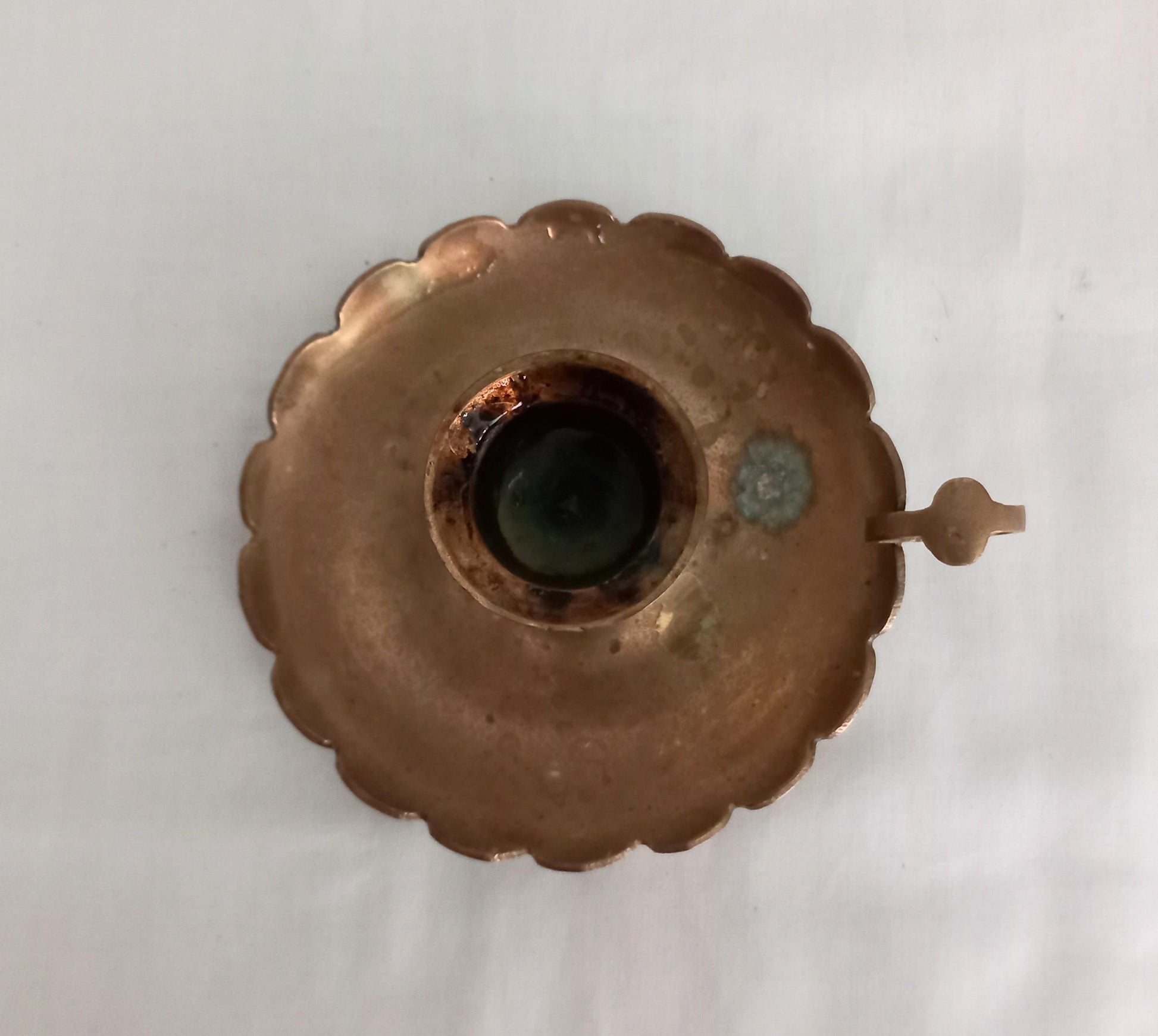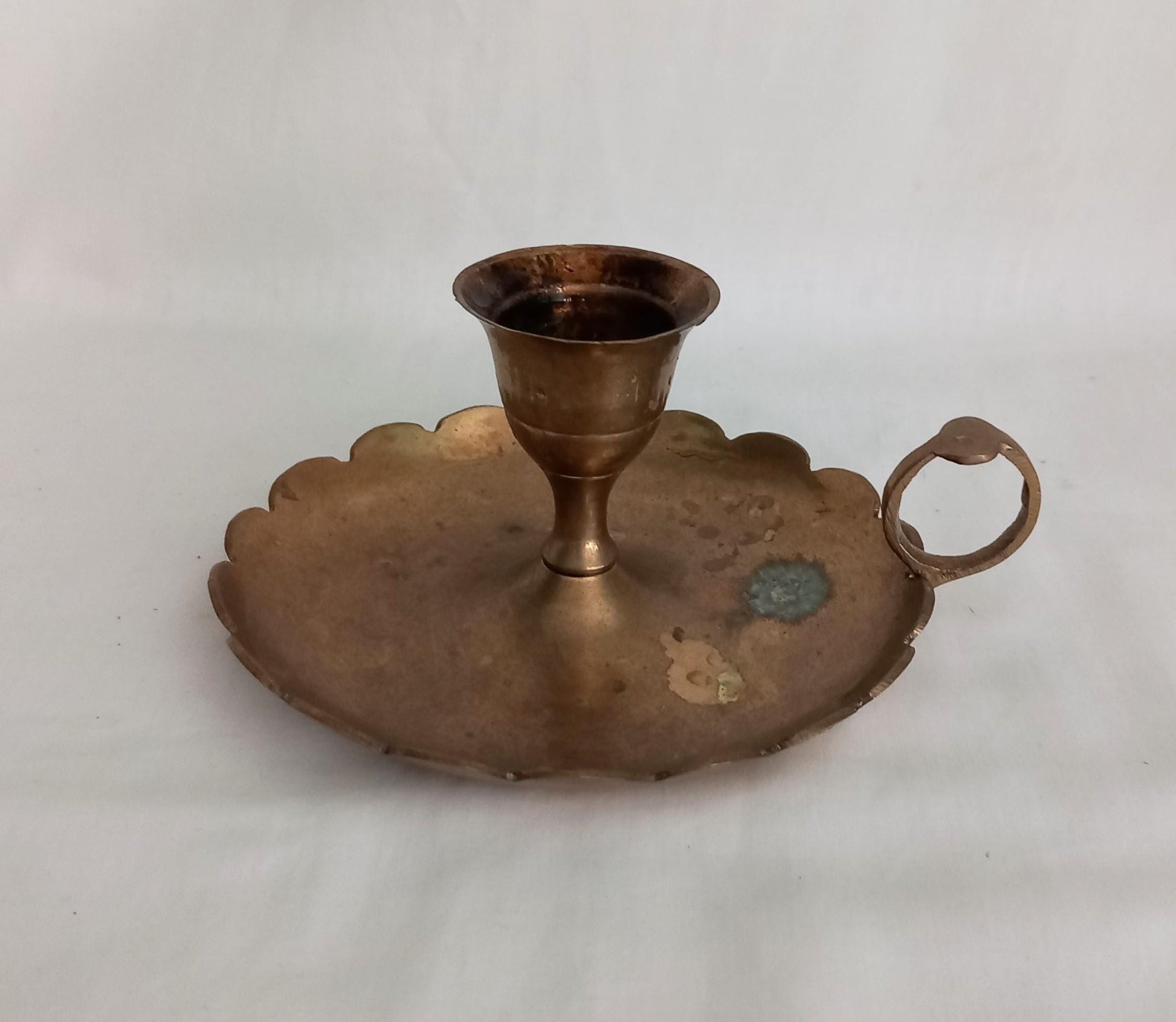 Vintage gold brass chamber stick style candle holder, 4.75 inches wide x 2.25 inches tall. This is in good vintage condition showing some wear to the brass.