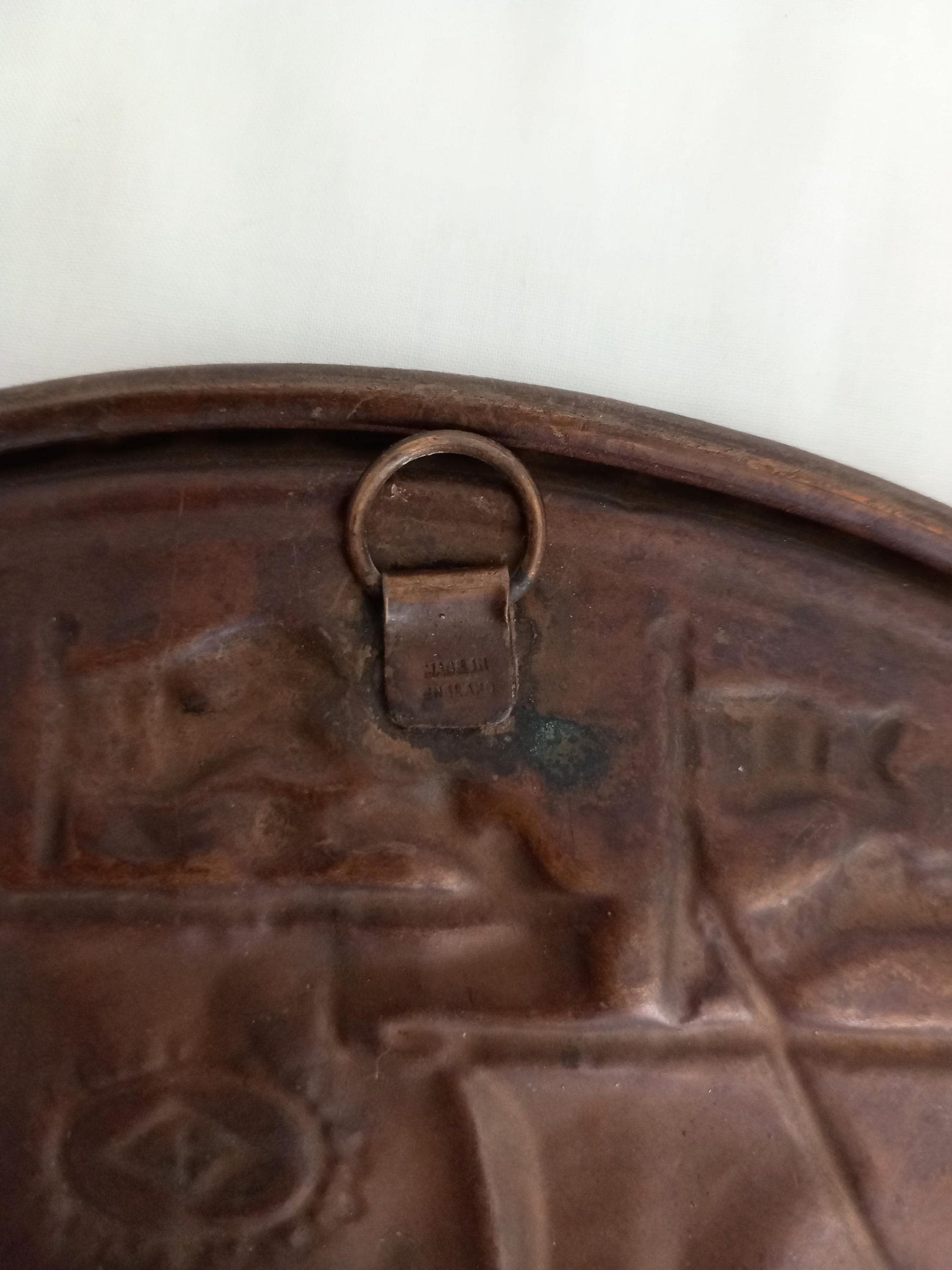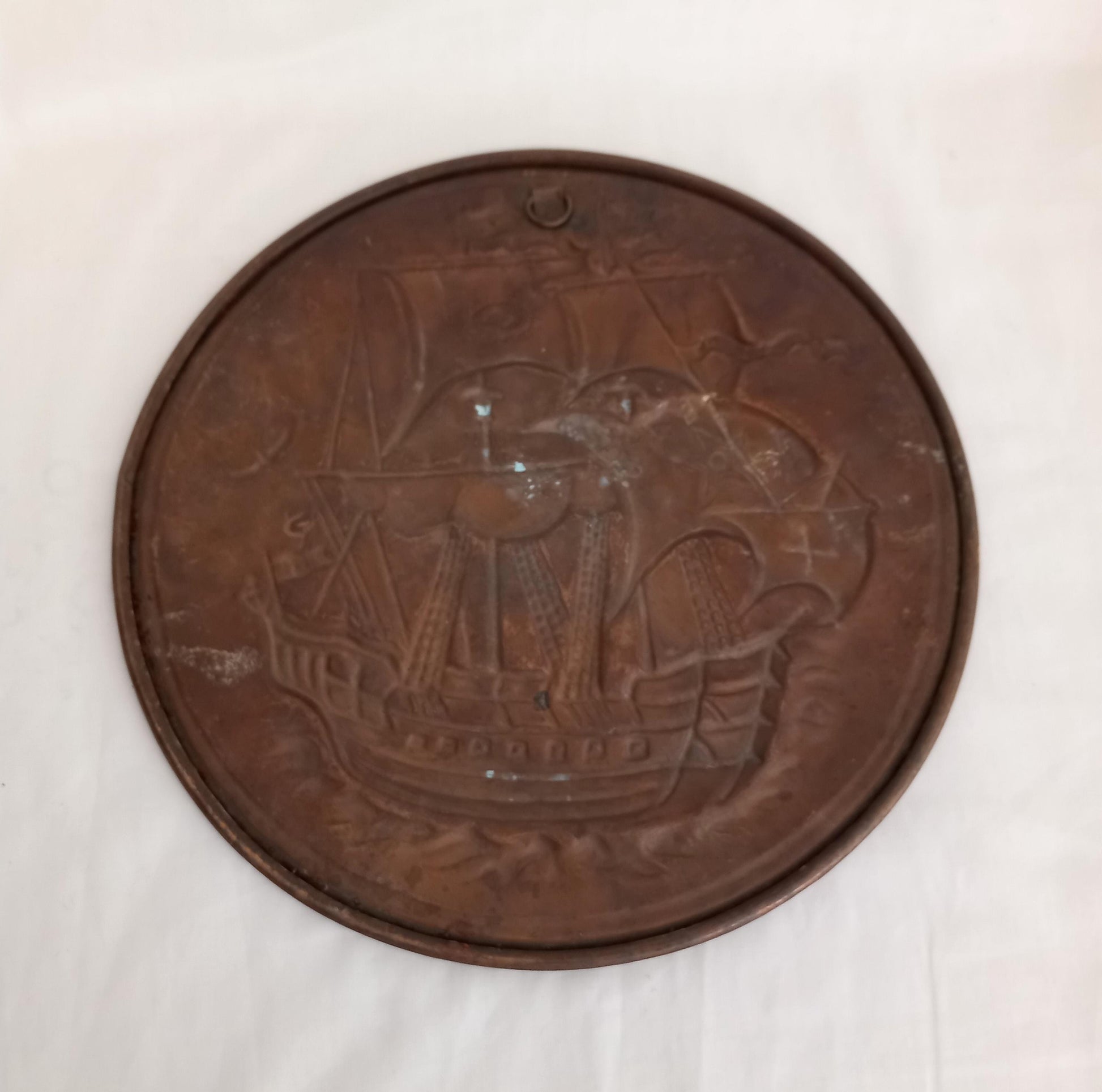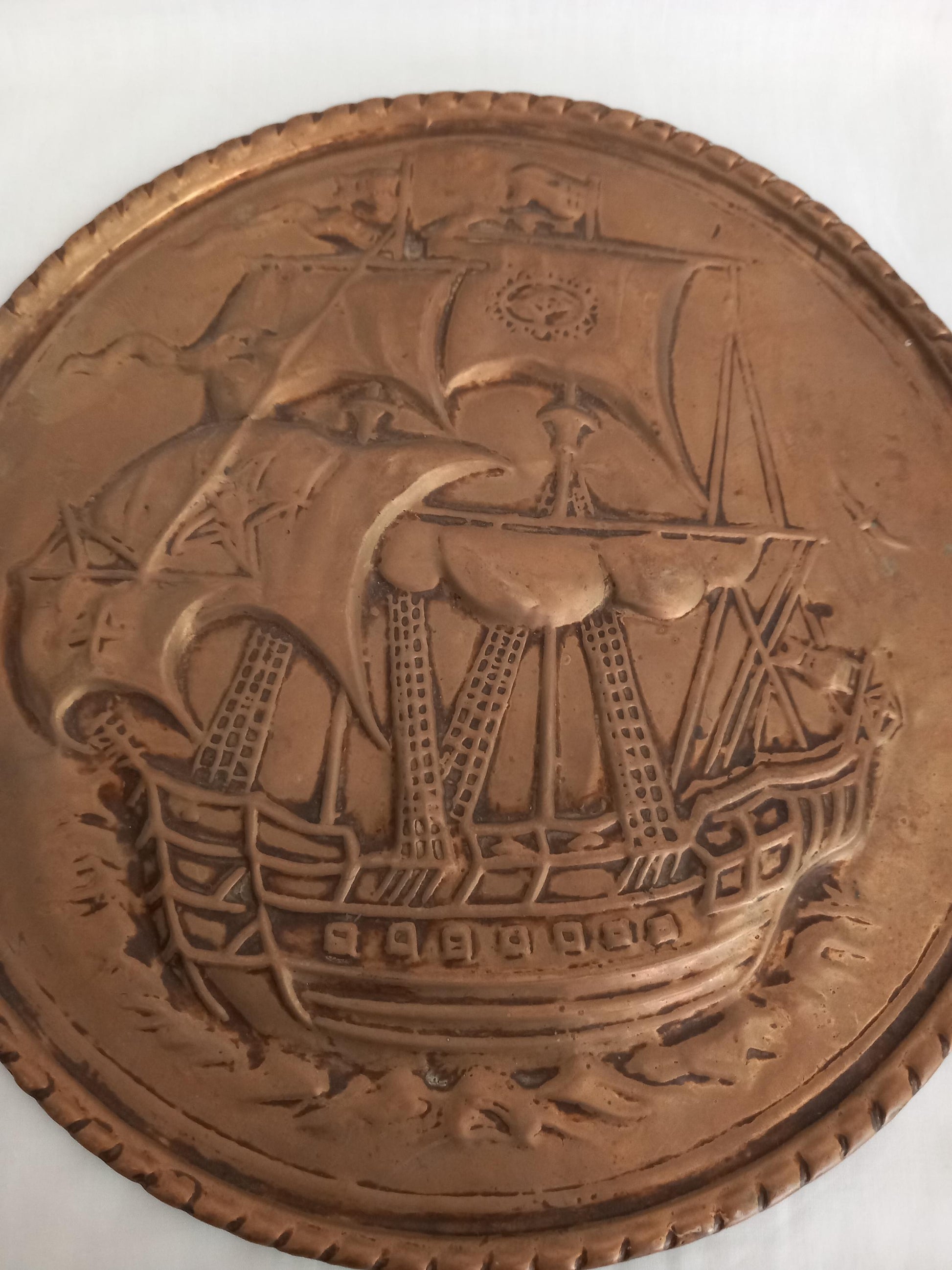 Vintage brass wall plaque with 3d ship design, 11 inches. This has a hook so it can be hung on the wall and is marked as made in England. Good vintage condition with patina.