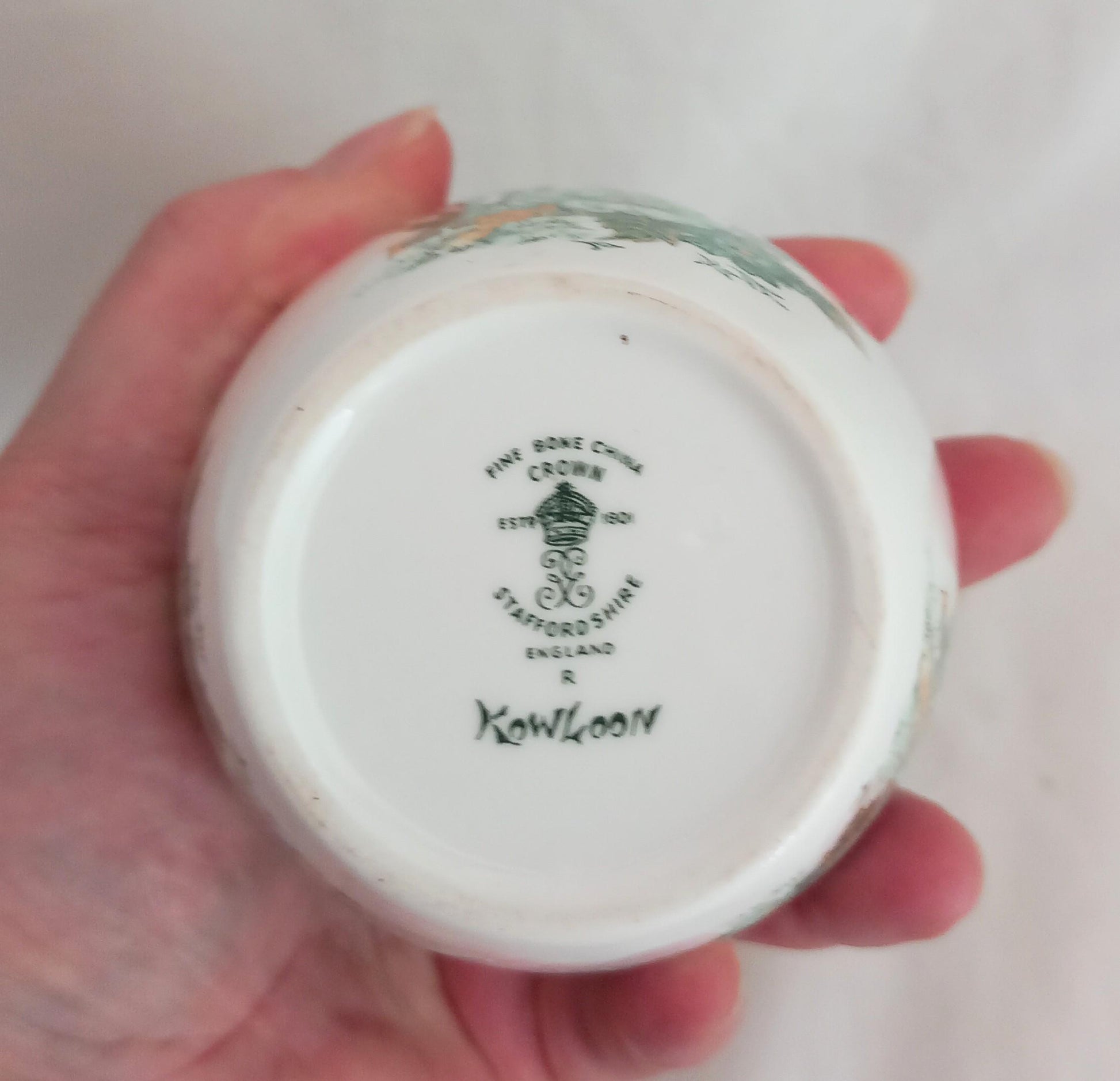 Vintage Crown Staffordshire Kowloon floral pattern green and yellow bone china Chinese style ginger jar, 3.5 inches tall. Good condition with no chips or cracks.