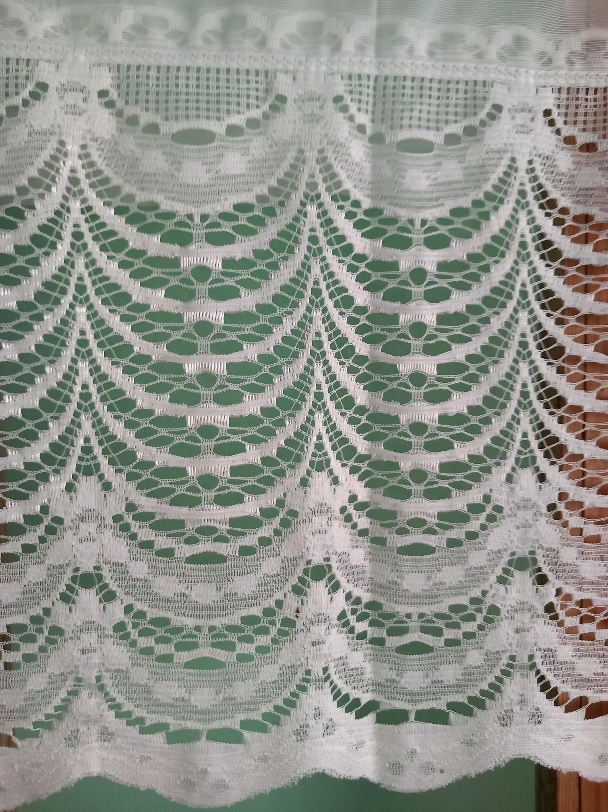 Vintage curved scalloped design white net curtain panel, 34" long and 34" wide. Good vintage condition apart from a couple of tiny spots near the top. This is from a house clearance and may need a wash to freshen it up.
