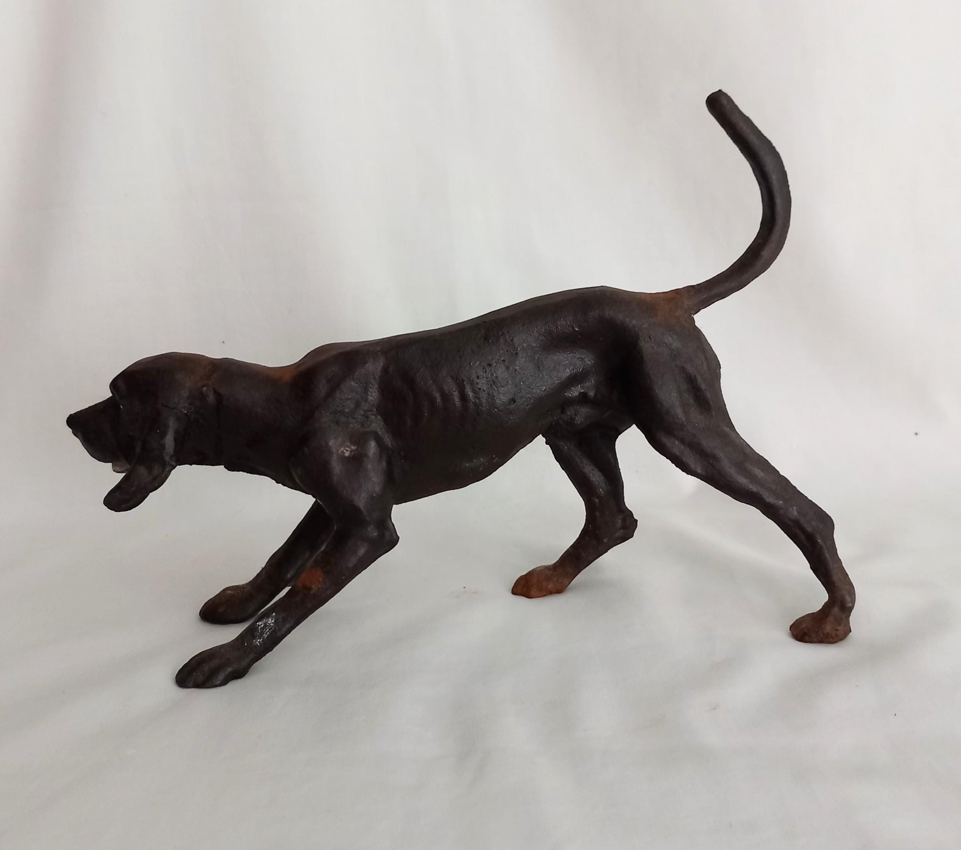 Vintage cast iron bloodhound dog Statue, 8.75 x 6.25 x 2 inches. This is in good vintage condition with some surface rust as pictured.