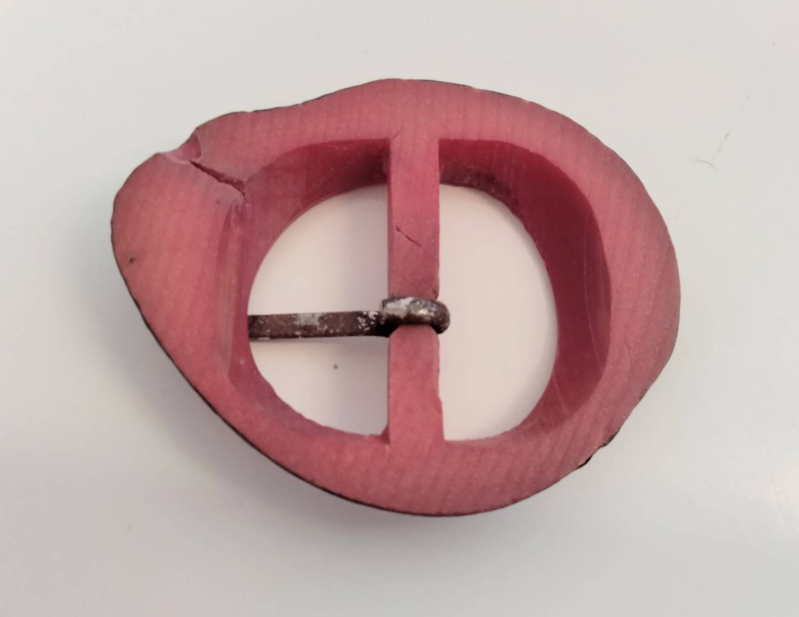 Approx 5.5 x 4.5 cm. Fair condition showing rust to the metal and there is a crack on the back (doesn't go through to the front).