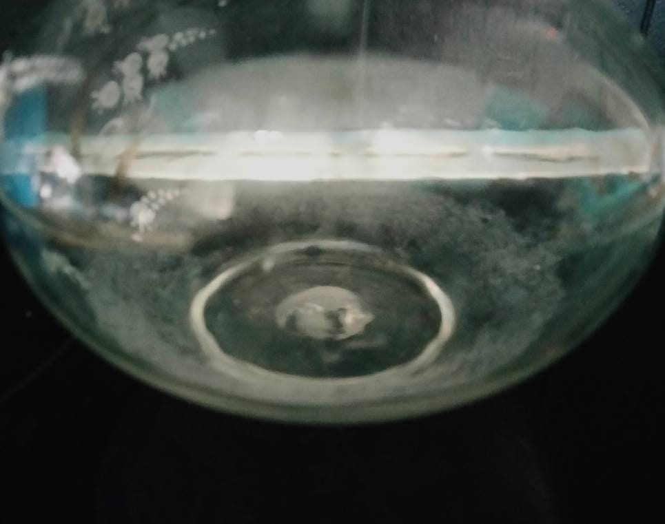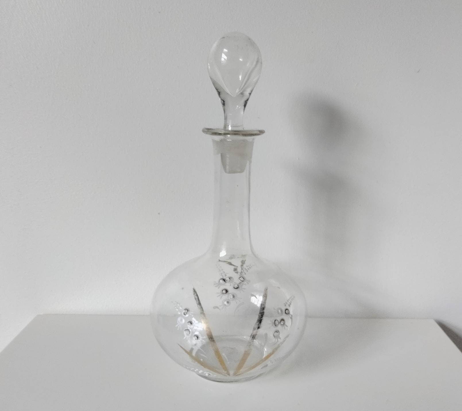 Antique hand blown decanter with white and gold decoration. Approx 9.75 inches tall with rough pontil mark on the base. It is also signed '15'. This is in good condition with no chips or cracks, but some of the white enamel has flaked off and it has water staining inside.