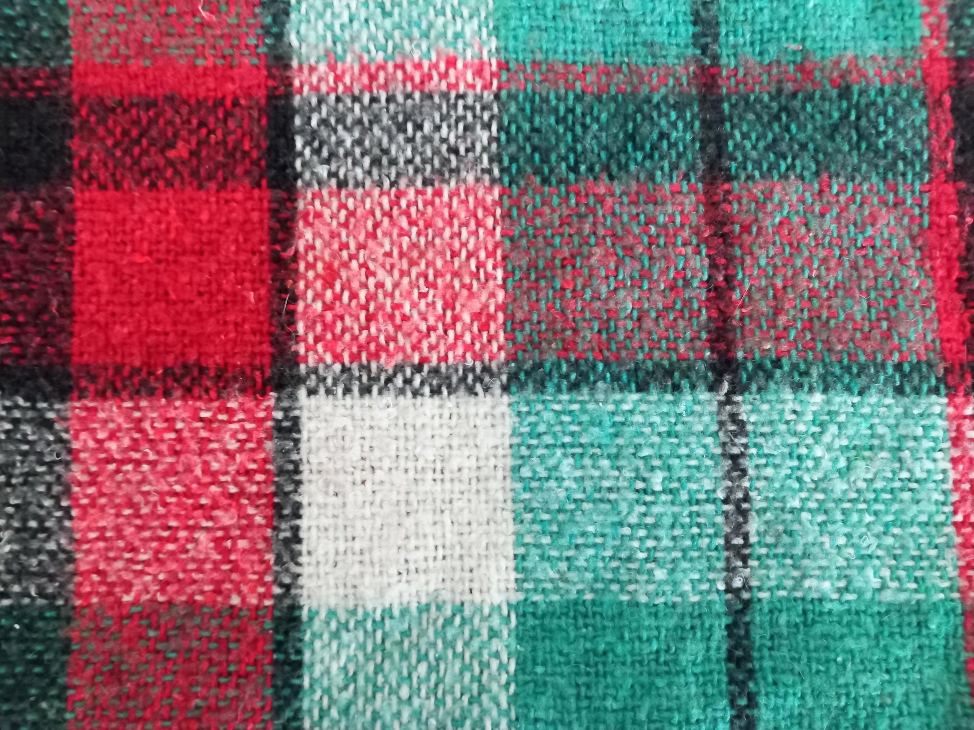 Vintage red and green checked pattern fringed blanket, 46 x 33 inches. Good vintage condition. This has been stored for a while and will benefit from a wash to freshen it up.