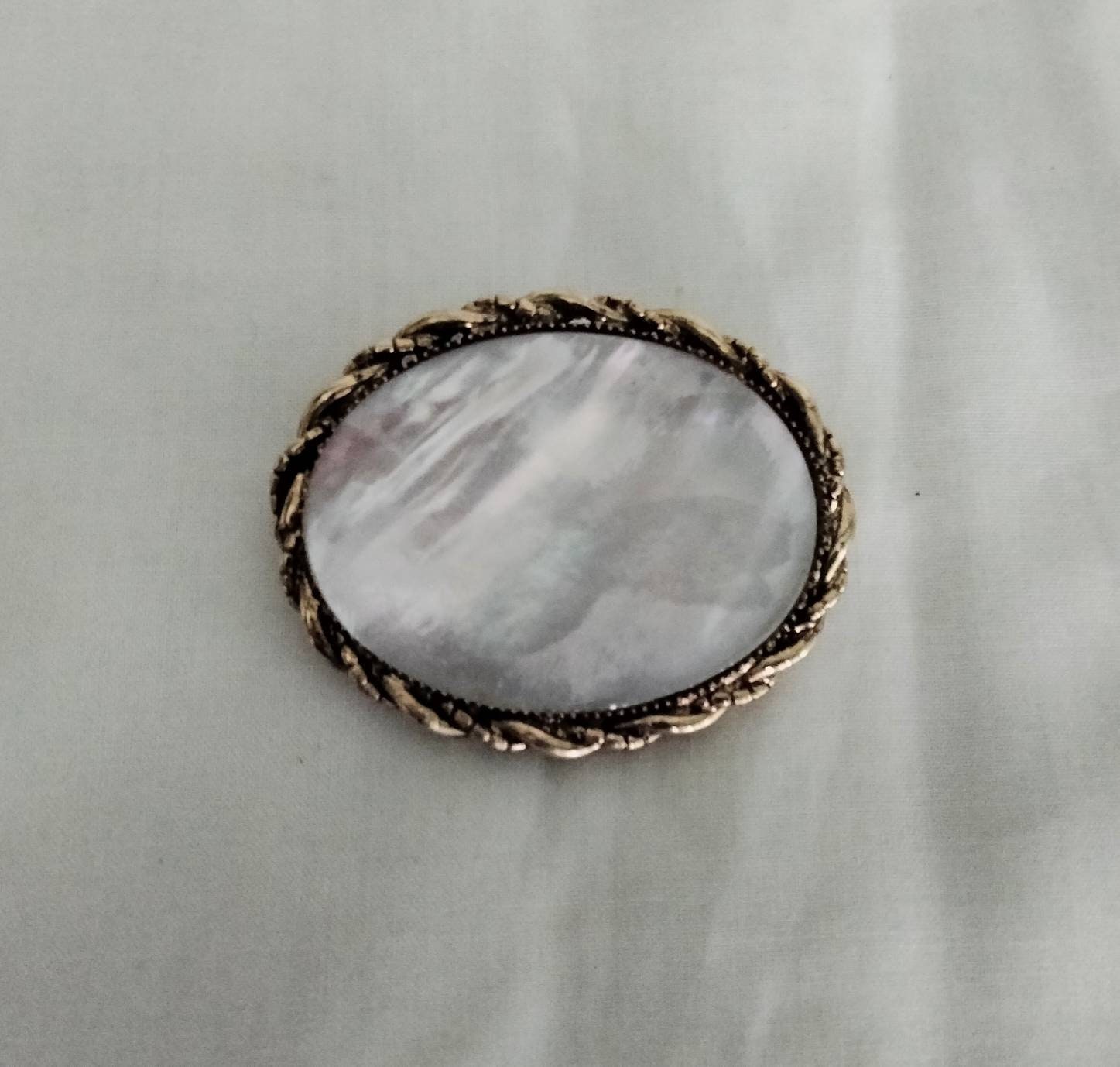Vintage goldtone rope twist & white mother of pearl oval brooch