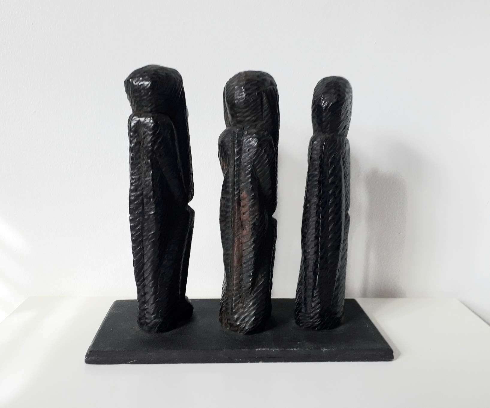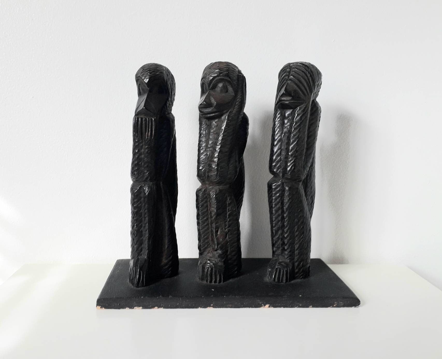 Vintage hand carved ebonised wood 3 wise monkeys figurine statue hear no evil, see no evil, speak no evil