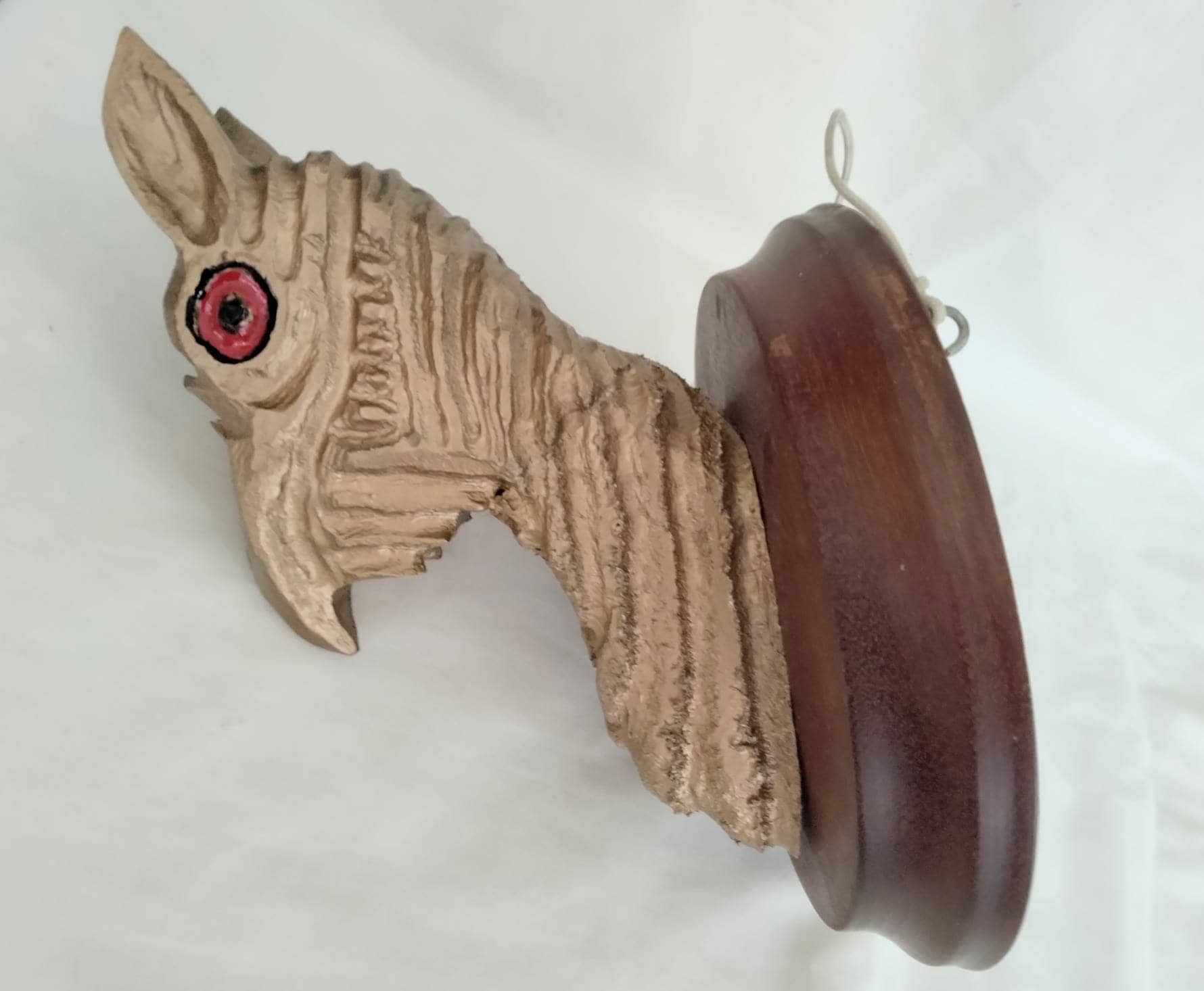 Vintage hand carved wooden mounted griffen or dragon head wall art sculpture, painted gold with red eyes, 8.5 x 5.5 inches. Good condition showing minor wear.