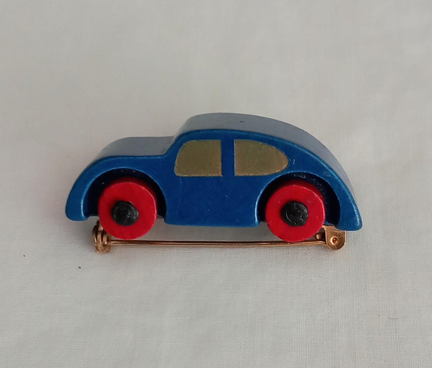 Vintage hand made blue & red wooden car brooch with moving wheels, 4.5 x 2 cm. Good vintage condition showing minor wear.