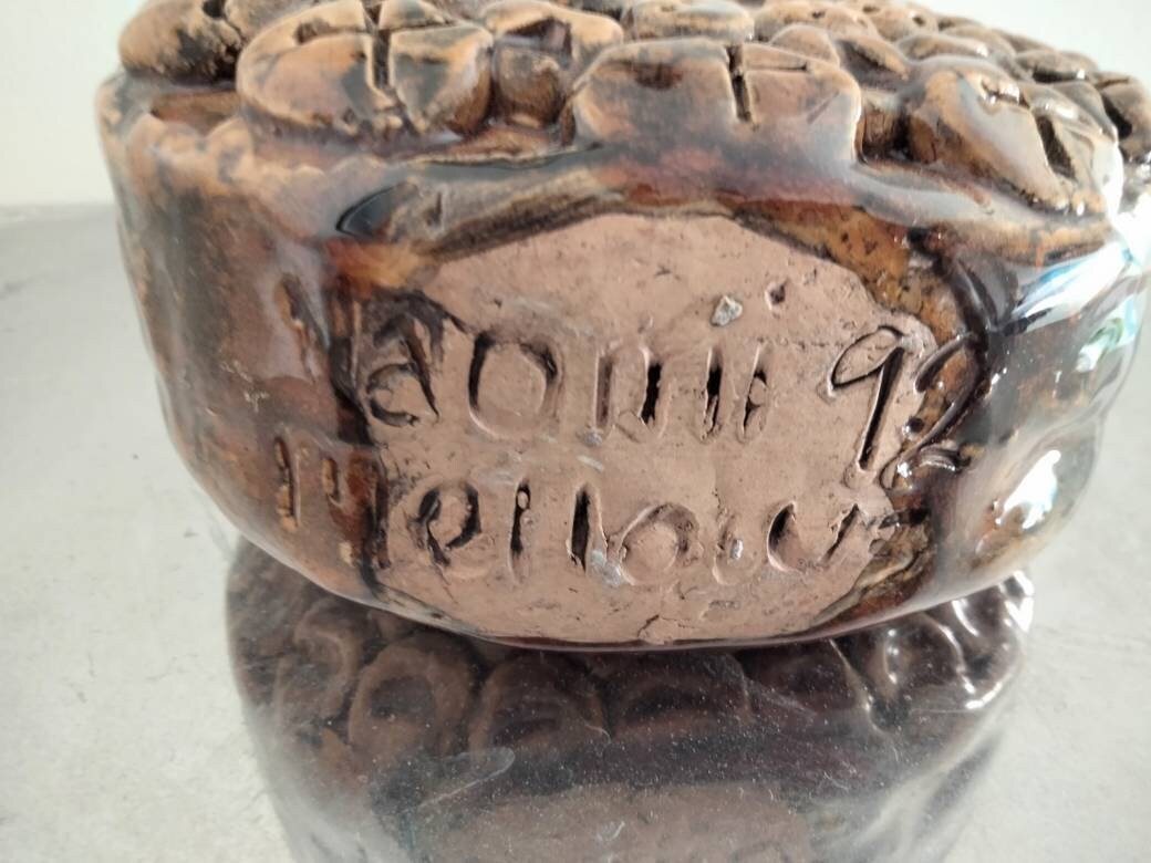 Beautiful naive clay vase, 4.5 inches tall and 5.5 inches wide. Good condition with no chips or cracks. Marked on the base Naomi Mellow 92.
