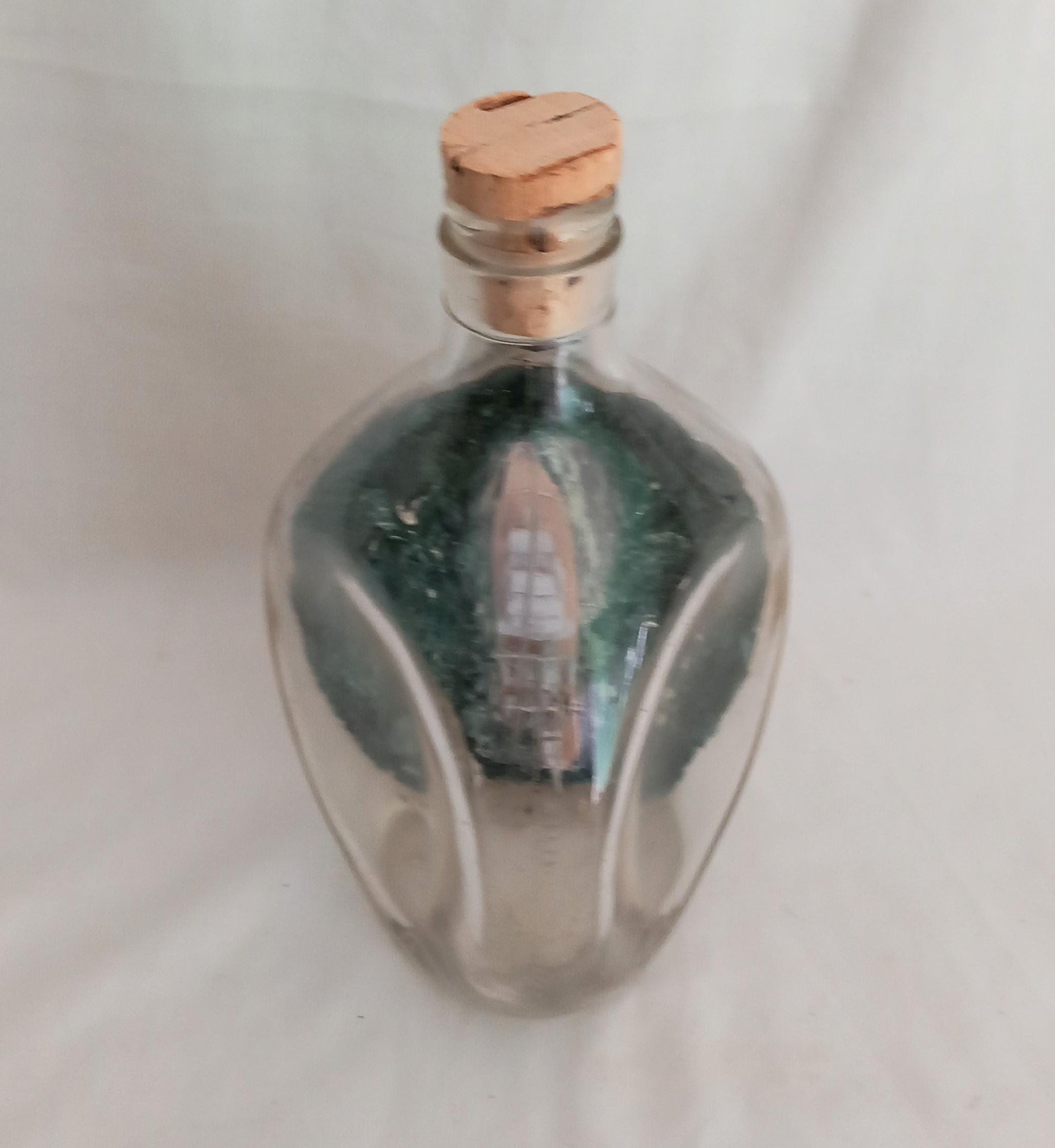 vintage hand made ship in a bottle of HMS Ajax in pinched triangular bottle