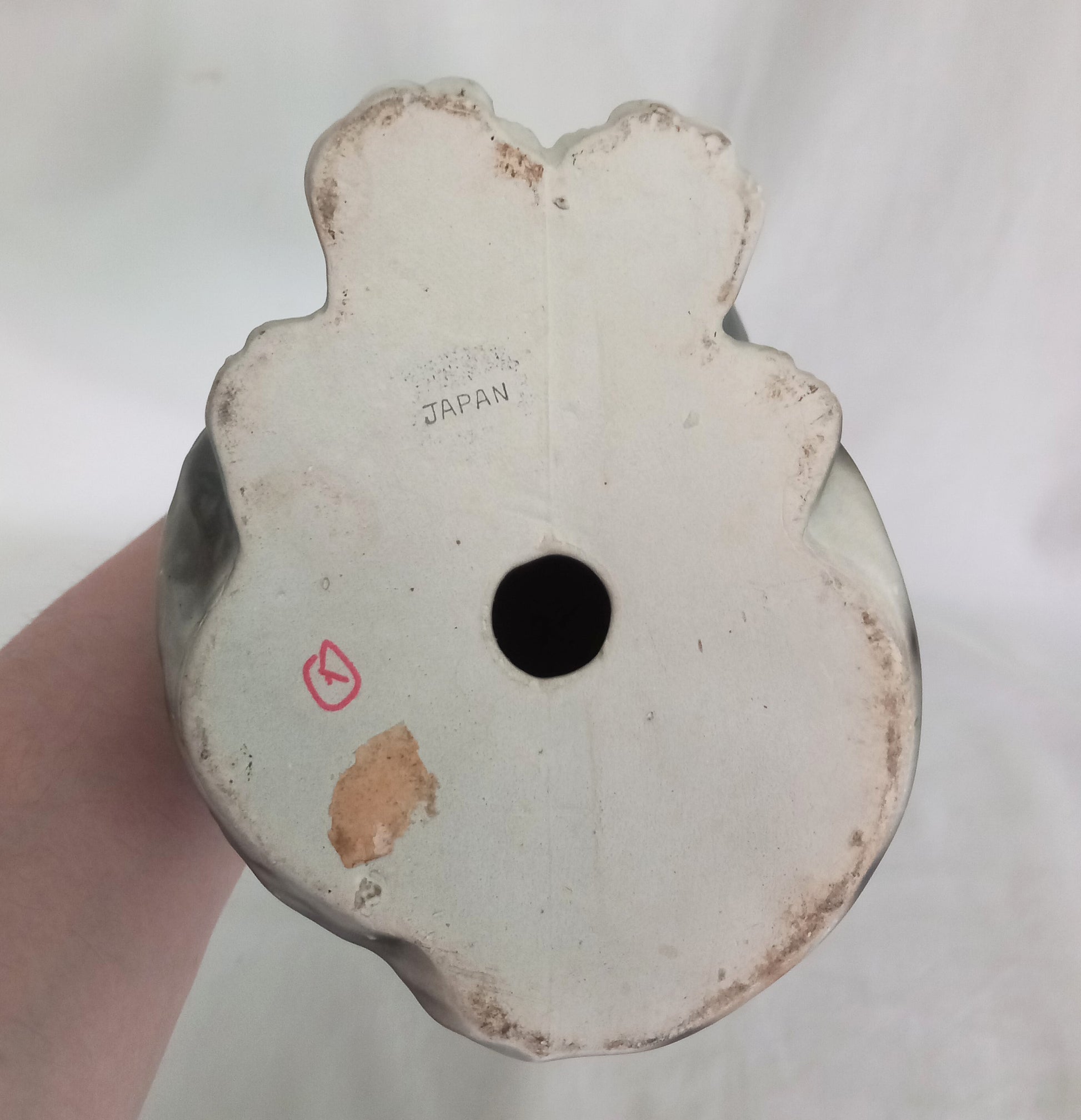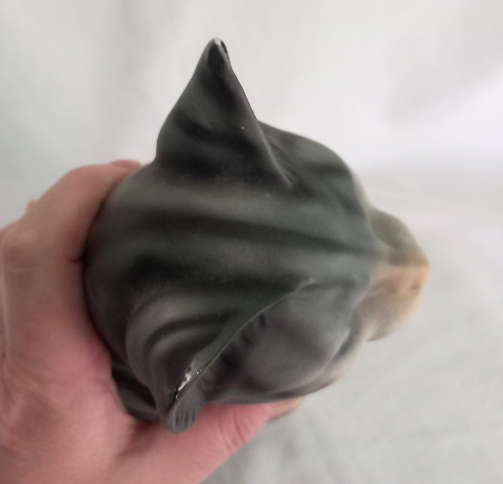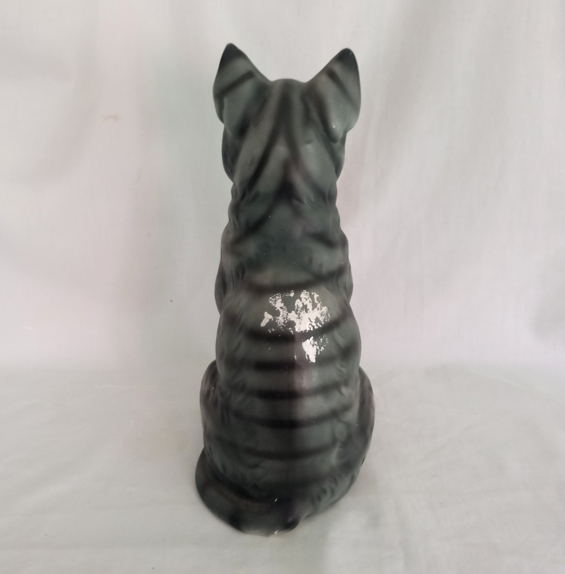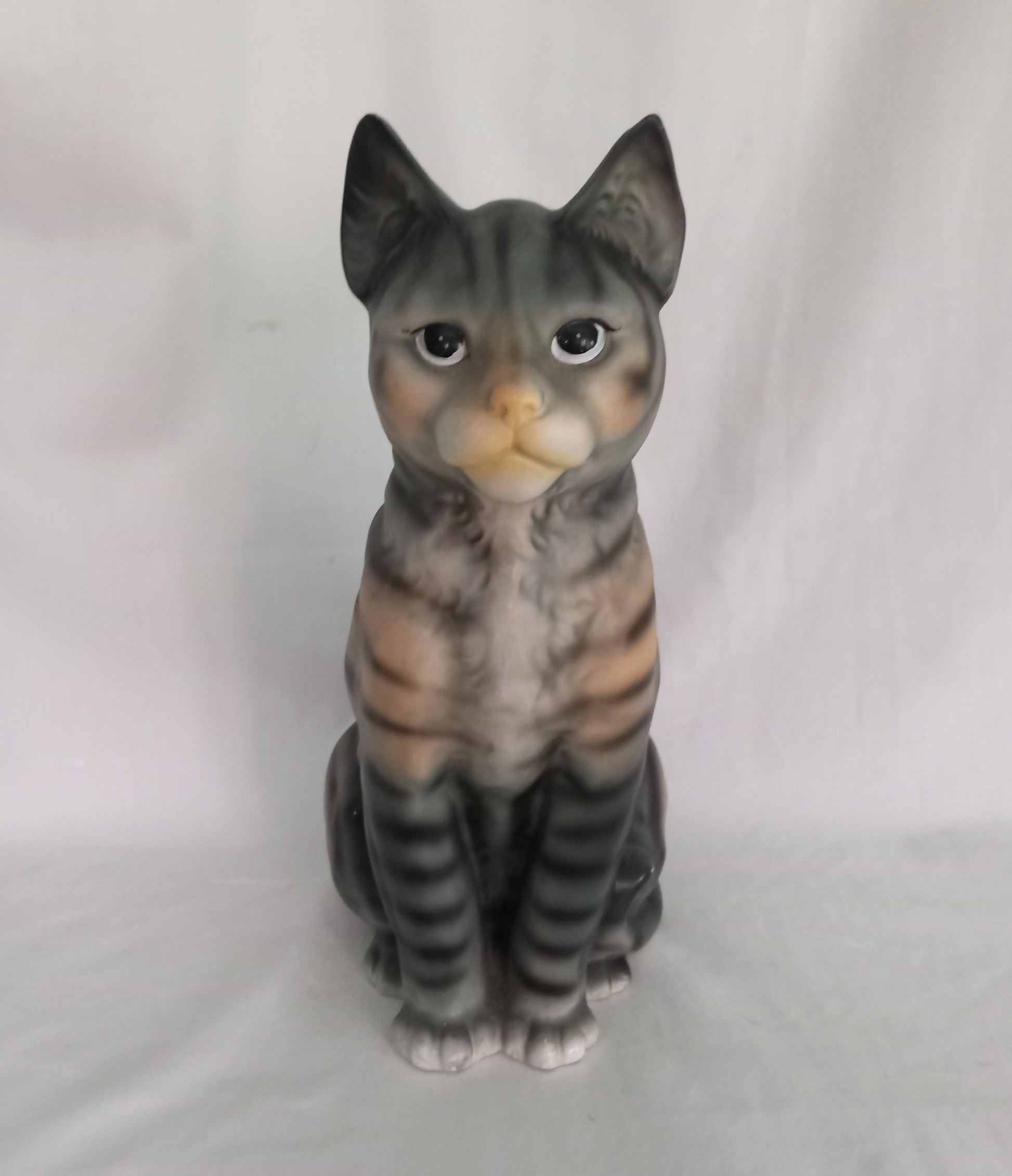 Vintage Japanese large grey tabby cat figurine, 11.75 inches tall and marked Japan on the base. Good vintage condition with no chips or cracks, but it has a patch of missing paint on the back where a sticker was removed, and wear to the colour on the ear tips.