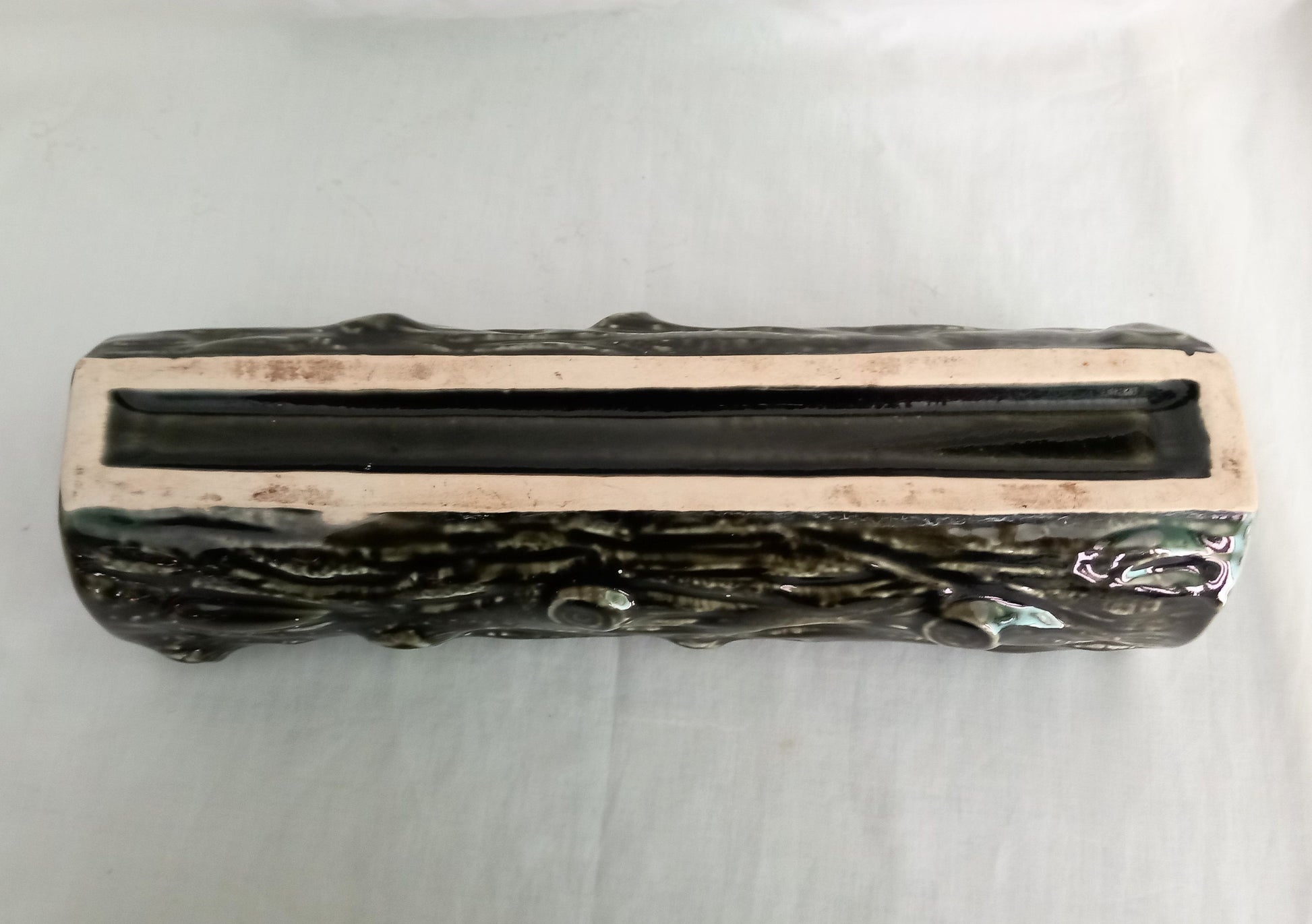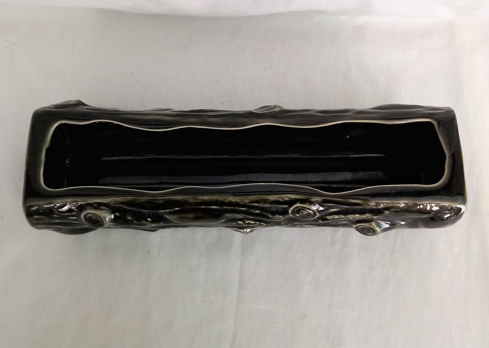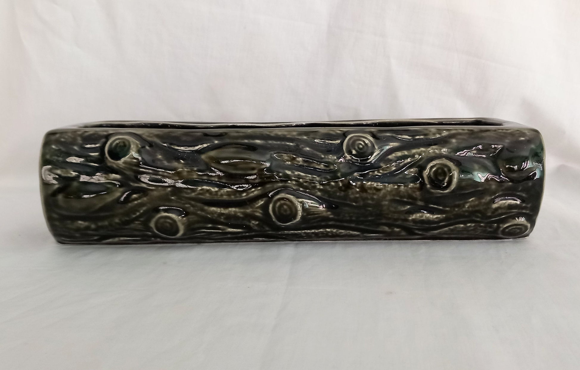 Vintage c1960s mid century large log design planter by Dartmouth Pottery in dark green, 31 x 9.5 x 7.5cm. Good condition with no chips or cracks. It is marked on the base but it is very difficult to read.