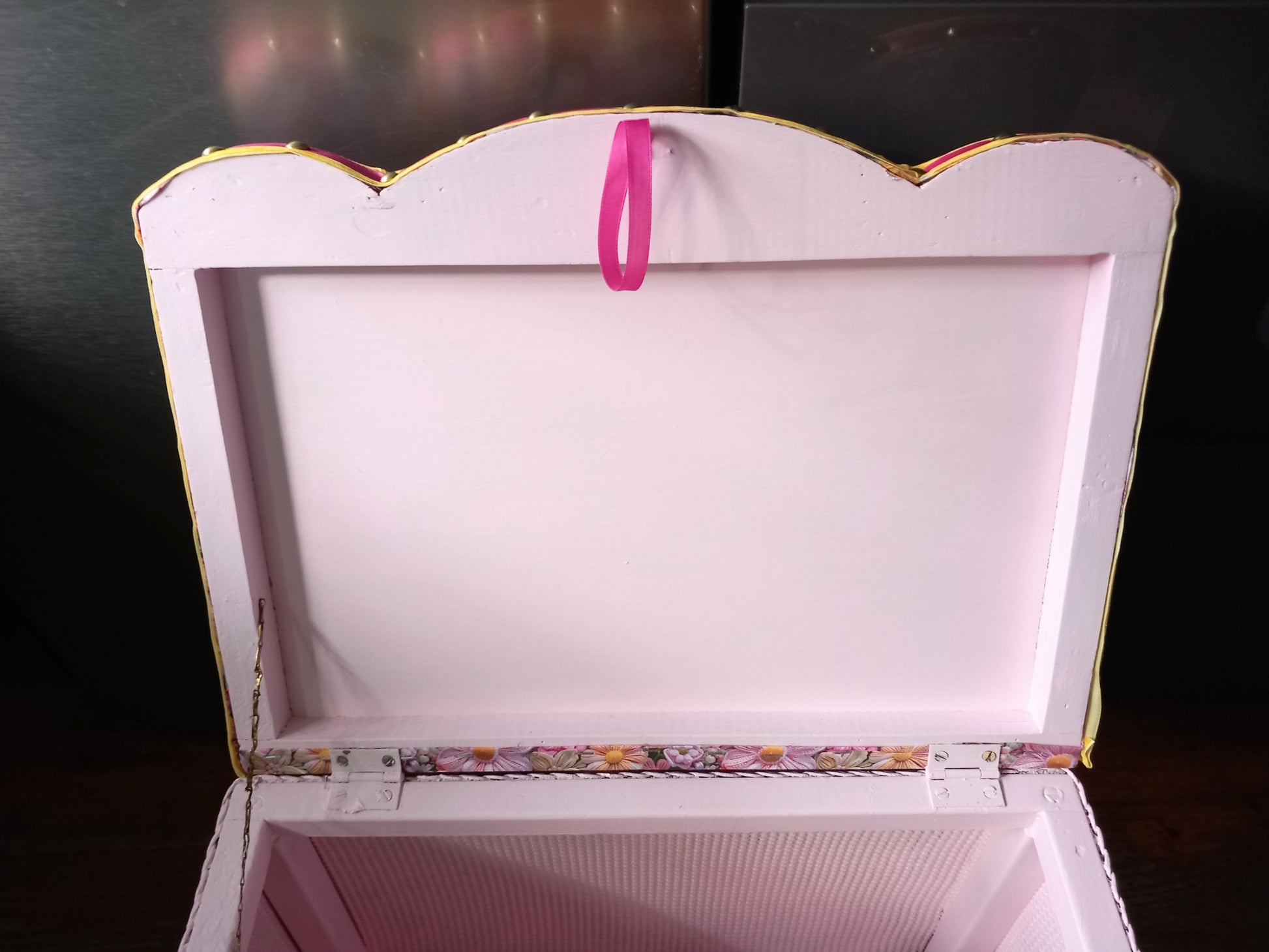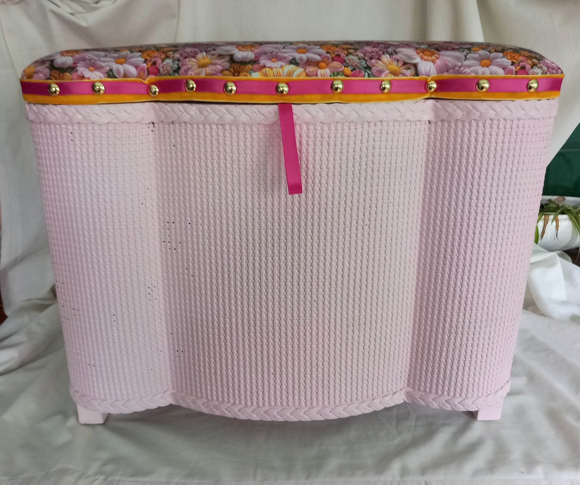 Vintage Lloyd Loom style laundry or storage box seat. This has been painted pale pink inside and outside and reupholstered with pink and yellow 3d flower print fabric (fabric is flat) and finished with yellow velvet and pink satin ribbon and gold upholstery nails. Approx 18 x 13.5 inches and 15.25 inches tall.