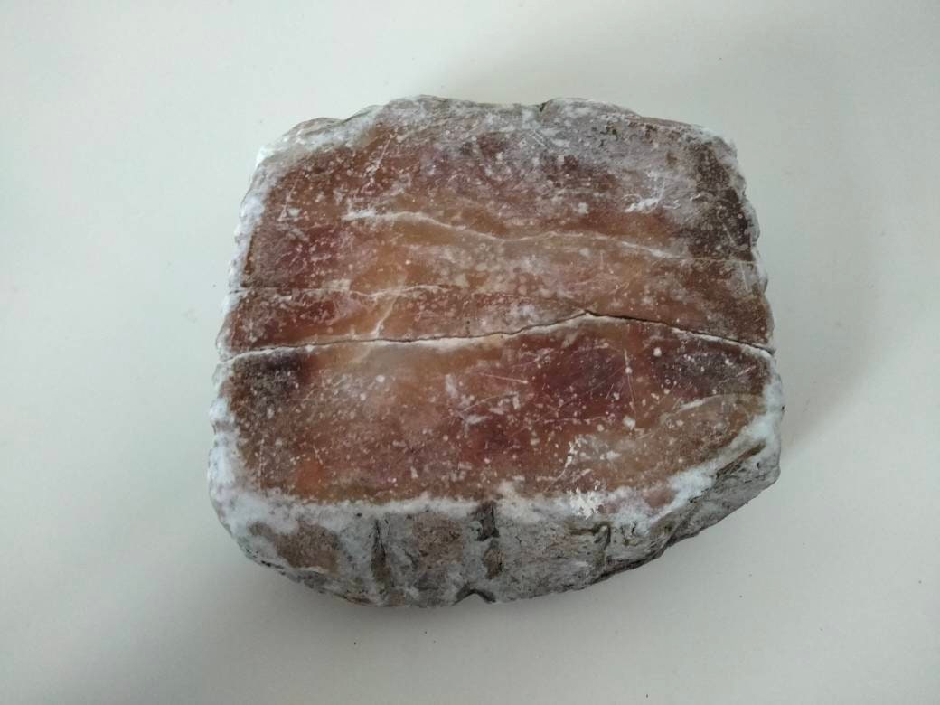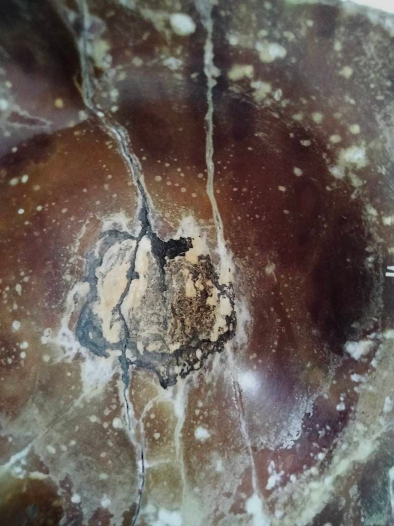 Approx 5 X 5 X 2 inches, attractive chestnut red/brown coloured stone, marble or similar. This has been used and is a bit battered but would look lovely if repolished. There is a circle of heat damage in the middle.