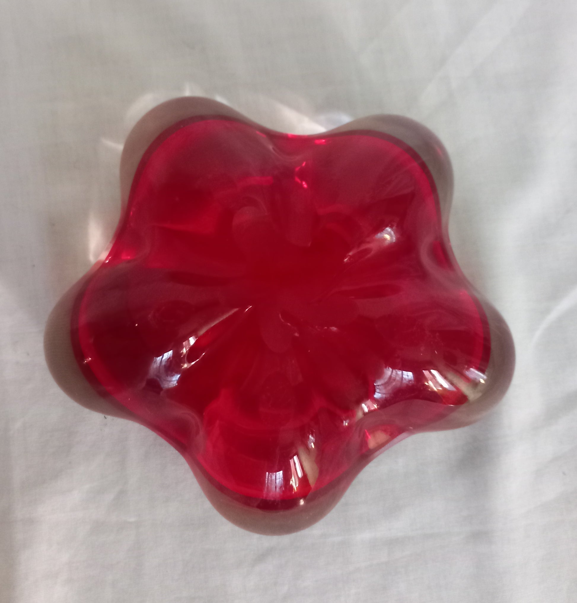 Vintage Mid Century Whitefriars #9408 ruby red 5 lobed cased glass bowl, 6 inches wide. Good condition apart from a small knock and chip next to each other on the rim of the bowl (the two damage photos are the same area).