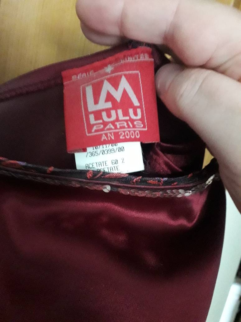This is a special or limited edition dress by Lulu Paris for the millennium celebrations in 2000. It is made of wine red satin with floral and sequin details and is finished with maribou feathers around the hem. It has an art deco look to it. It is size large to fit 12/14. The dress has unfortunately discoloured at the sides where it is slightly darker. There is also one piece of maribou missing.