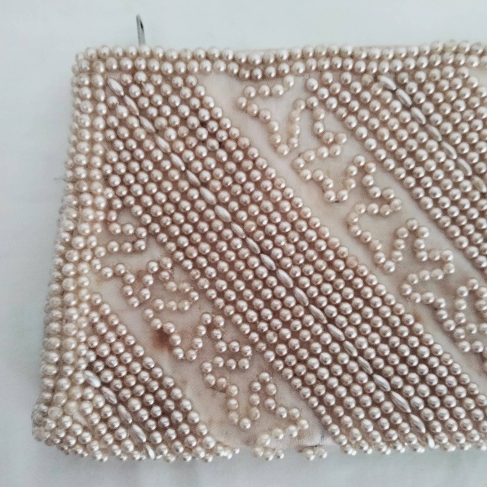 Vintage Miss Universe white cream satin glass pearl covered evening clutch bag