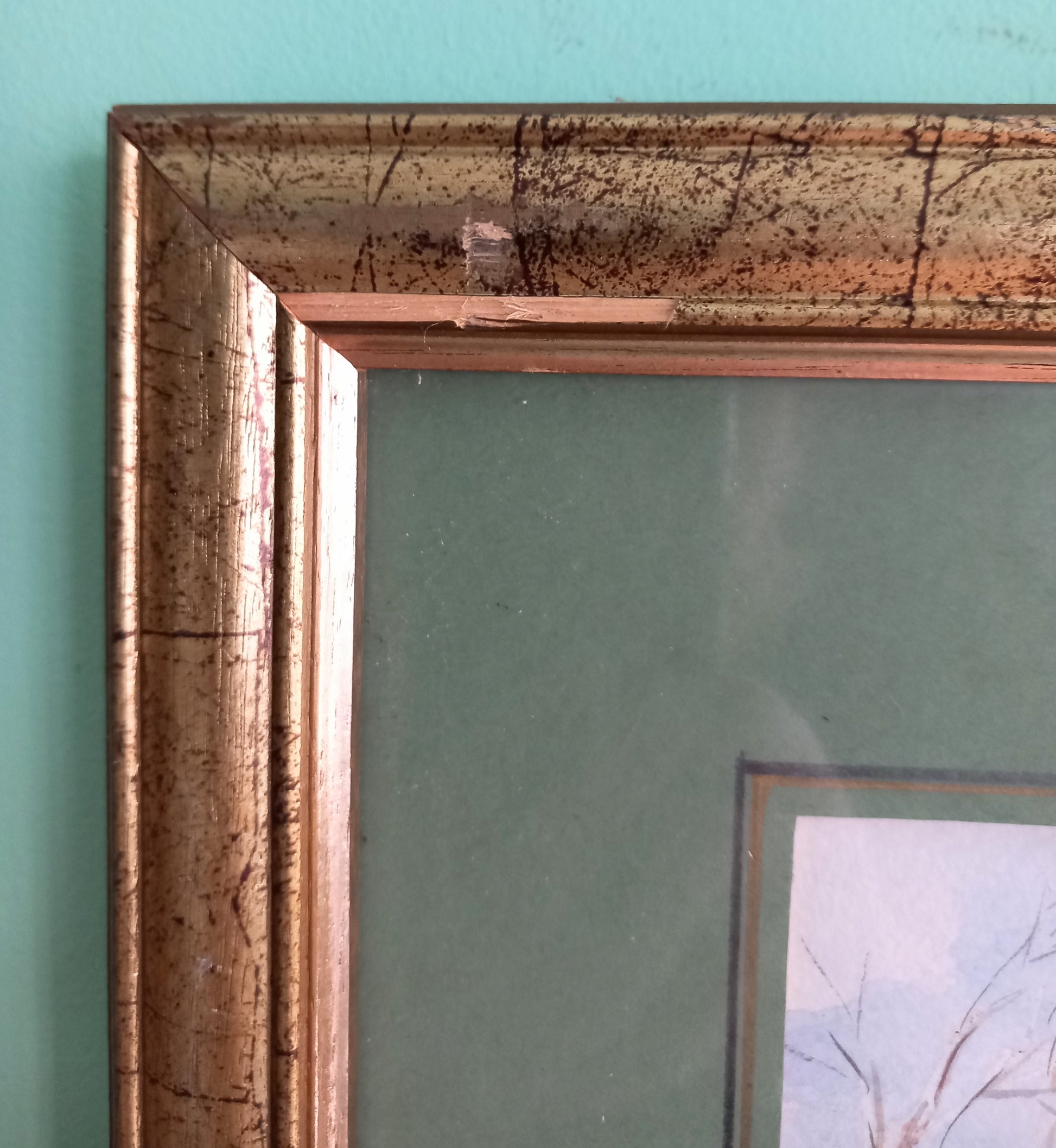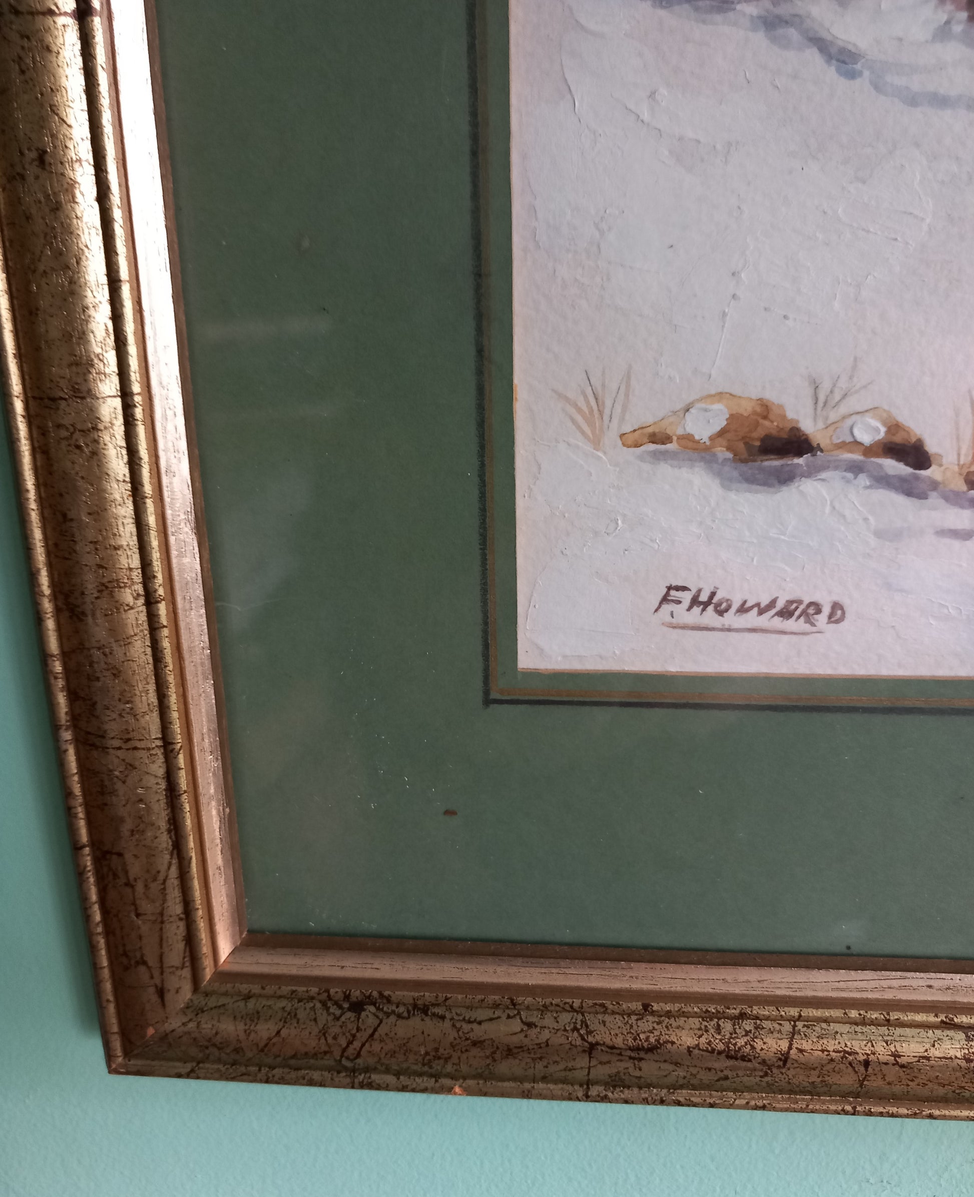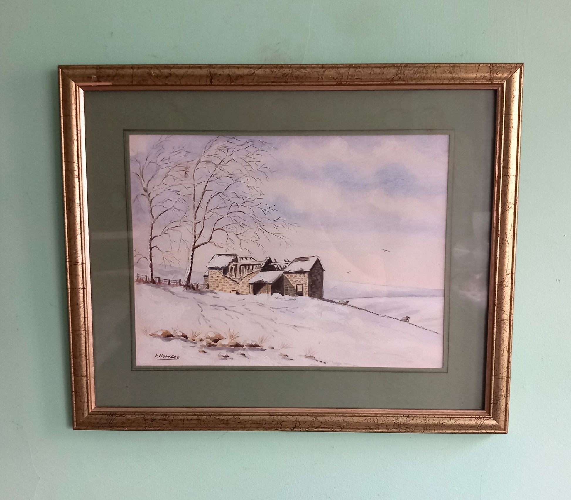 Vintage original watercolour painting of a ruined barn in a snowy winter landscape, signed F Howard. Approx 18 x 22 inches with gilt wooden frame. Good vintage condition apart from some water drop marks on the green mount board.