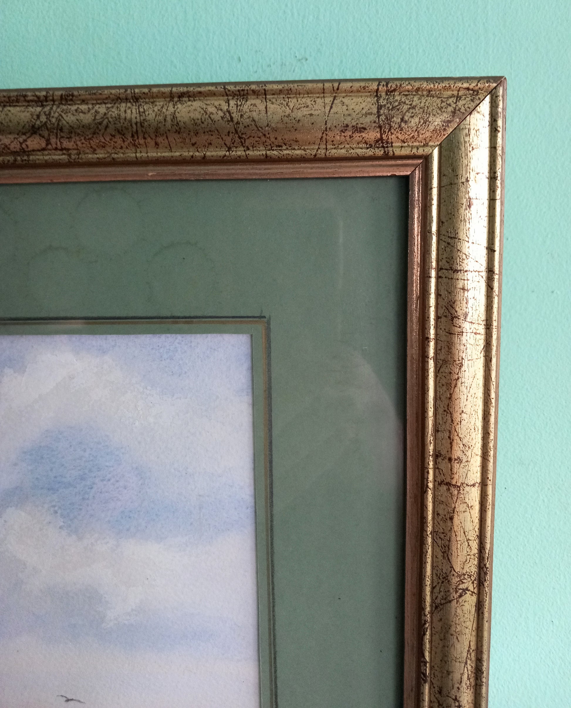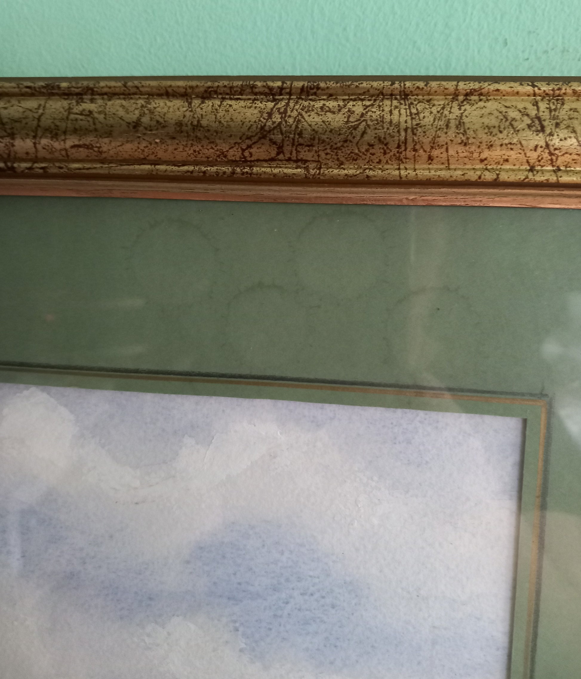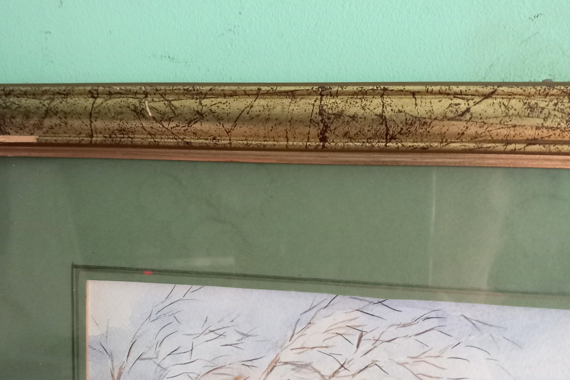 Vintage original watercolour painting of a ruined barn in a snowy winter landscape, signed F Howard. Approx 18 x 22 inches with gilt wooden frame. Good vintage condition apart from some water drop marks on the green mount board.