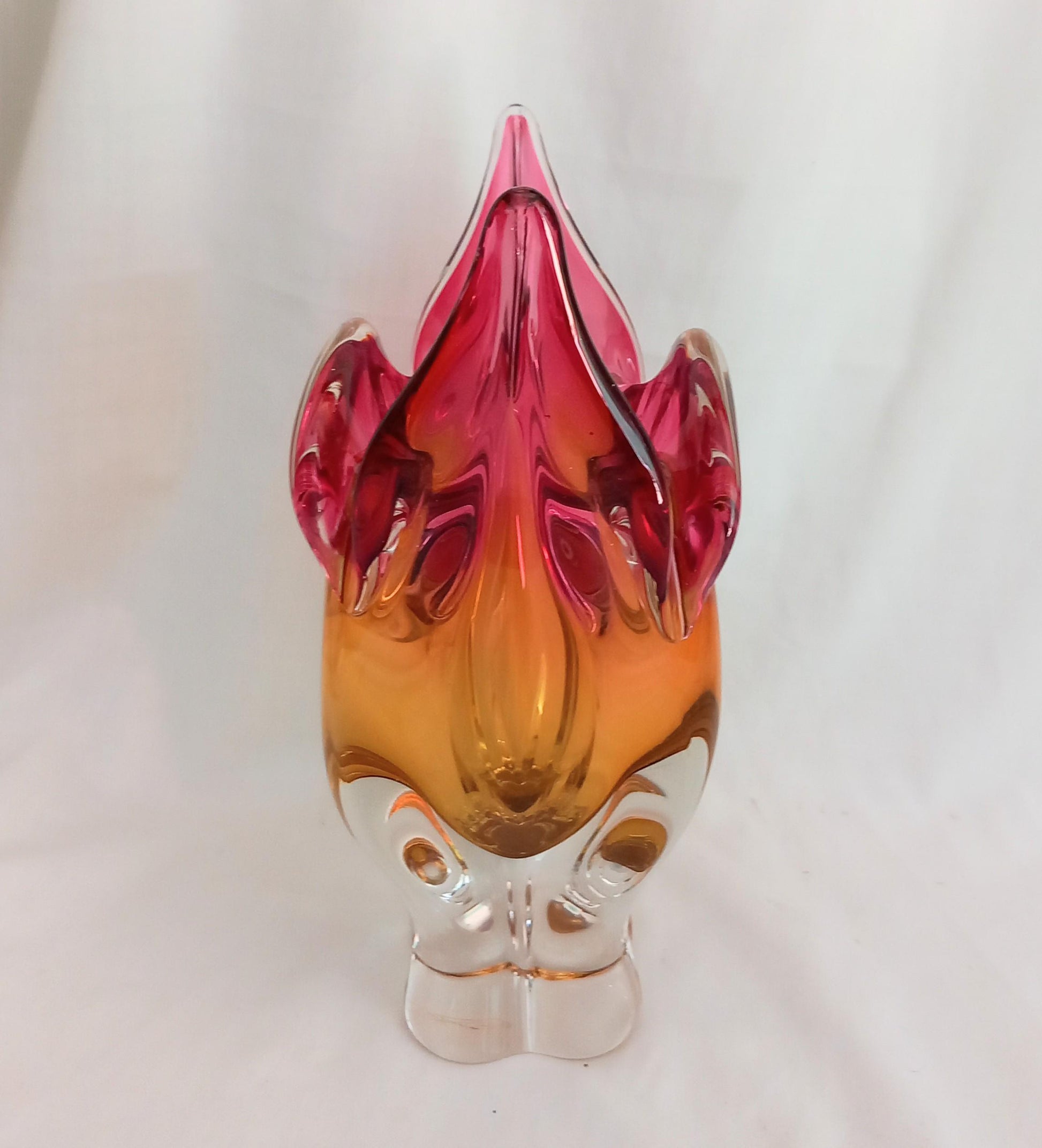 Vintage pink and yellow Sklo Union Glass Chribska Cats Head vase by Josef Hospodka, 9.25 inches tall. Good condition with no chips or cracks.