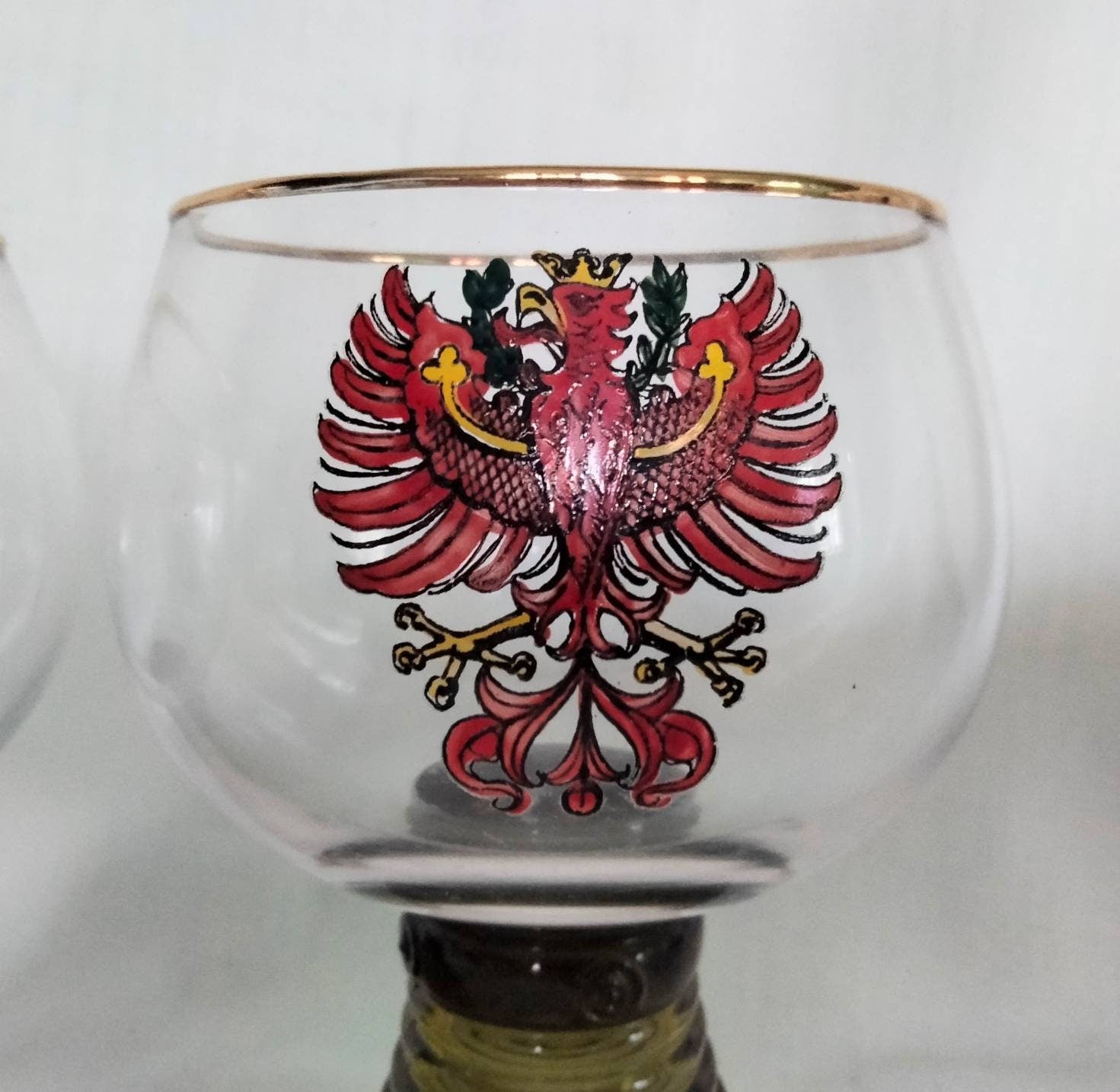 1970s pair of red phoenix design green glass beehive stem wine glasses