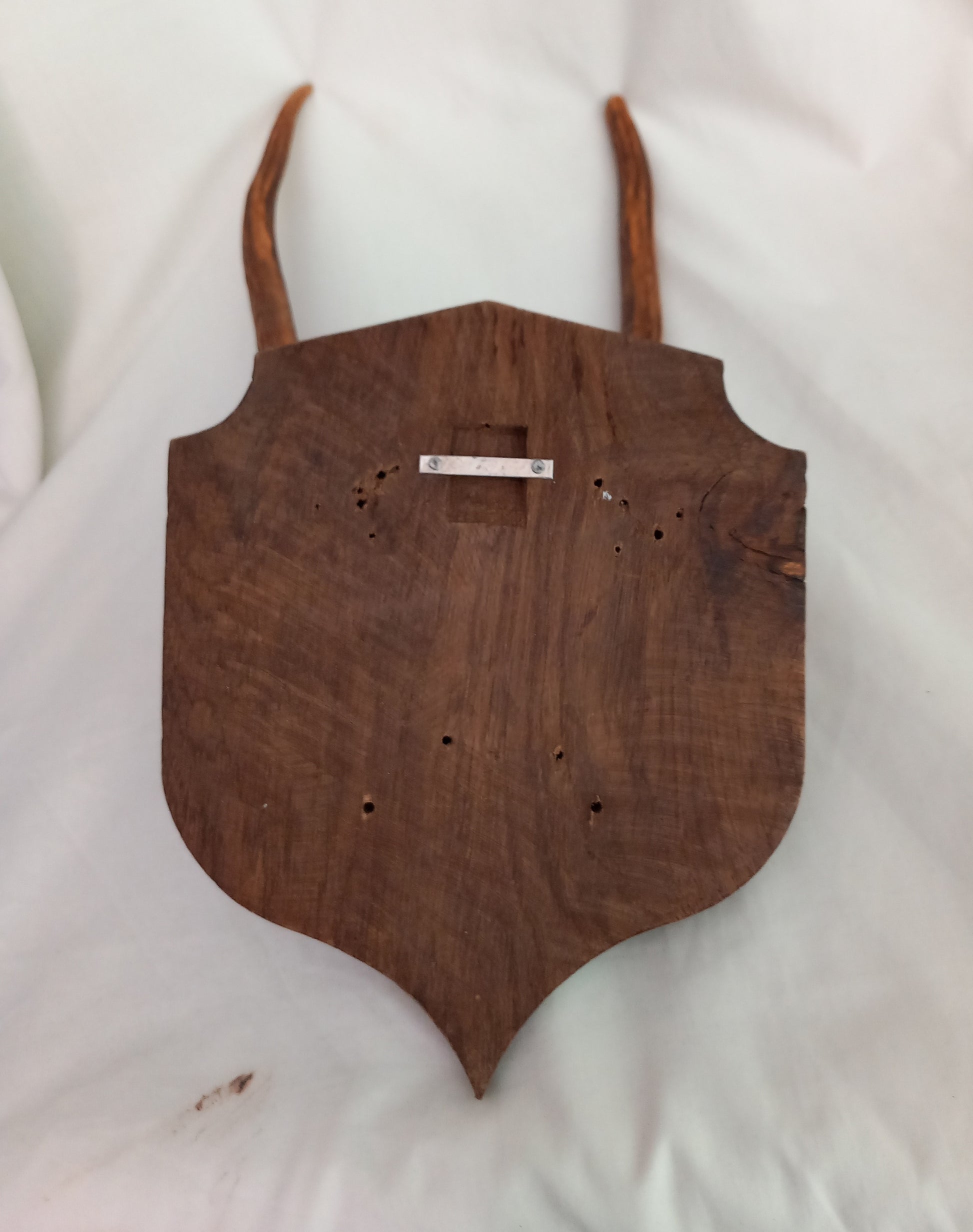 Vintage Roe Deer skull cap & antlers mounted on wooden shield, 16 x 7 inches overall. The antlers are approx 10 inches. Both the skull and shield have some additional holes where they have been mounted differently in the past. Good vintage condition apart from that.
