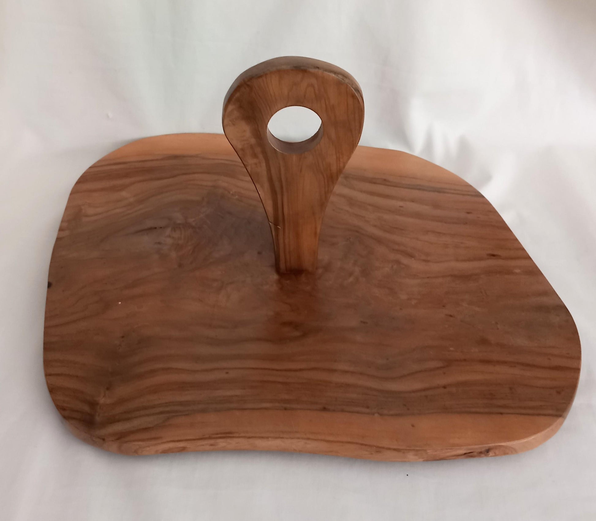 Vintage hand made solid wood slice serving or cheese board with handle, 13 x 13 x 8 inches. The handle has a groove cut into it which is designed to hold a knife. The handle also unscrews for flat storage. Good vintage condition showing minor wear.