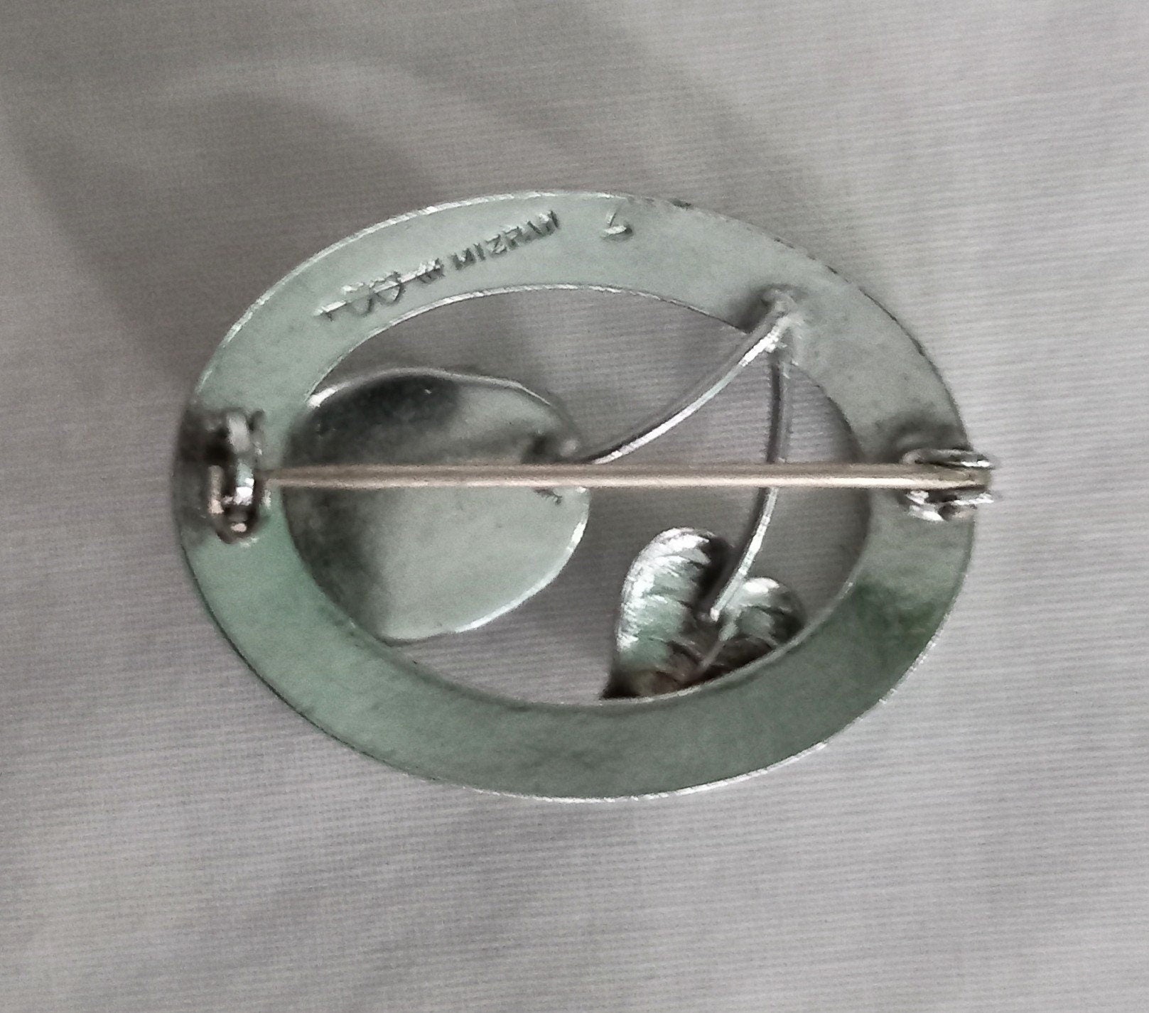 Vintage signed Mizpah flower design grey marble type stone brooch with thistle design edge, 3 x 2.5 cm. Signed on the reversed, very good condition.