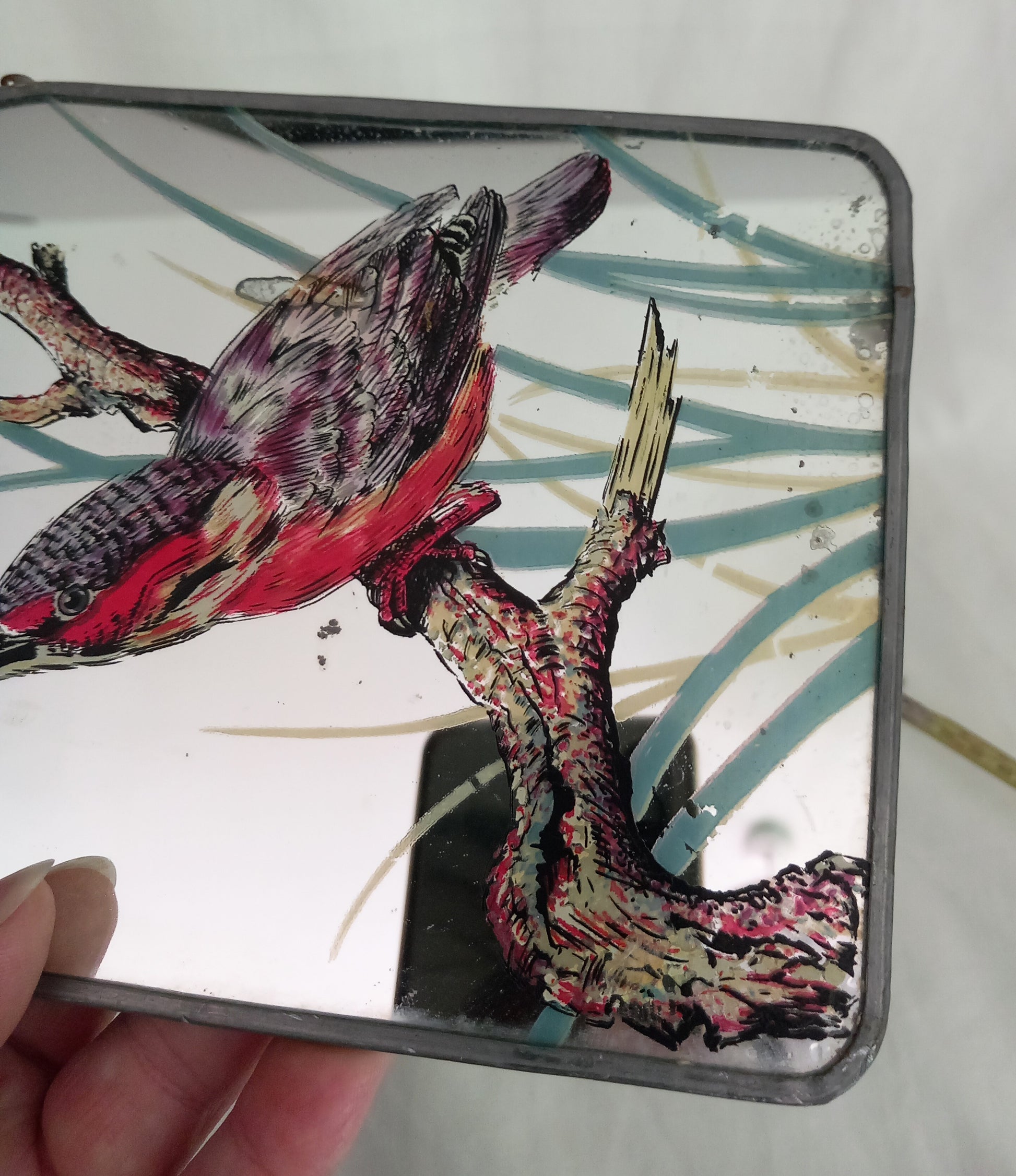 Vintage small arched wall mirror with bird design, 8 inches tall and 5.5 inches wide. It is in good vintage condition showing some wear to the design and ageing to the glass.