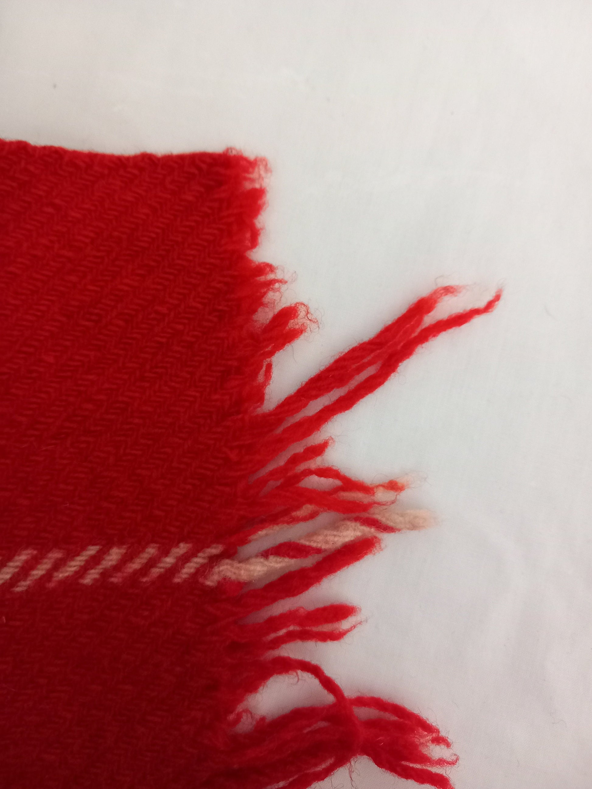Vintage red and green tartan pattern all wool fringed blanket, 56 X 62 inches. Suitable for bed or chair throw or as a picnic blanket. Good condition apart from a small area of missing fringe on one corner and a small hole on the edge as pictured. This has been stored for a while and will benefit from a wash to freshen it up.