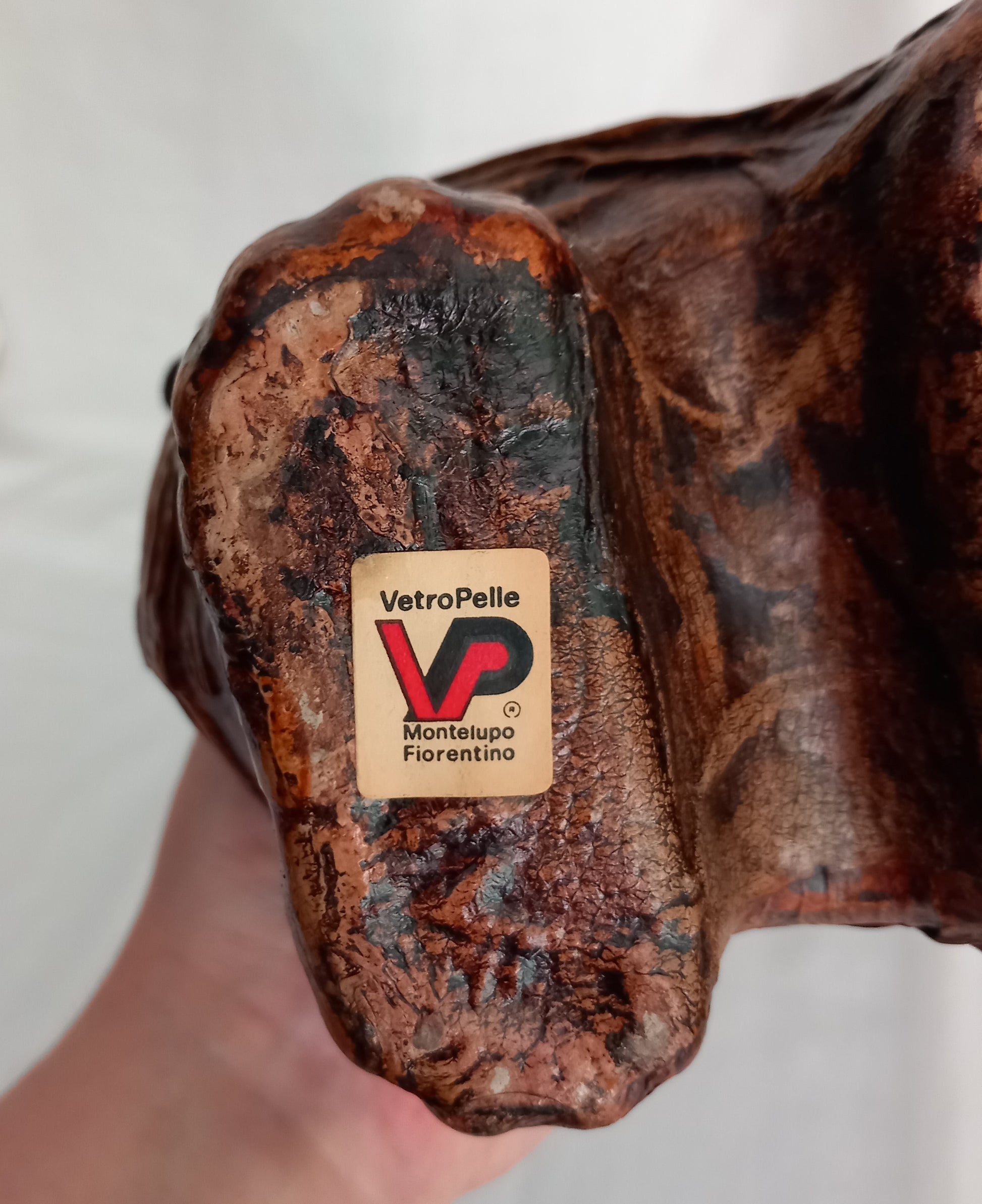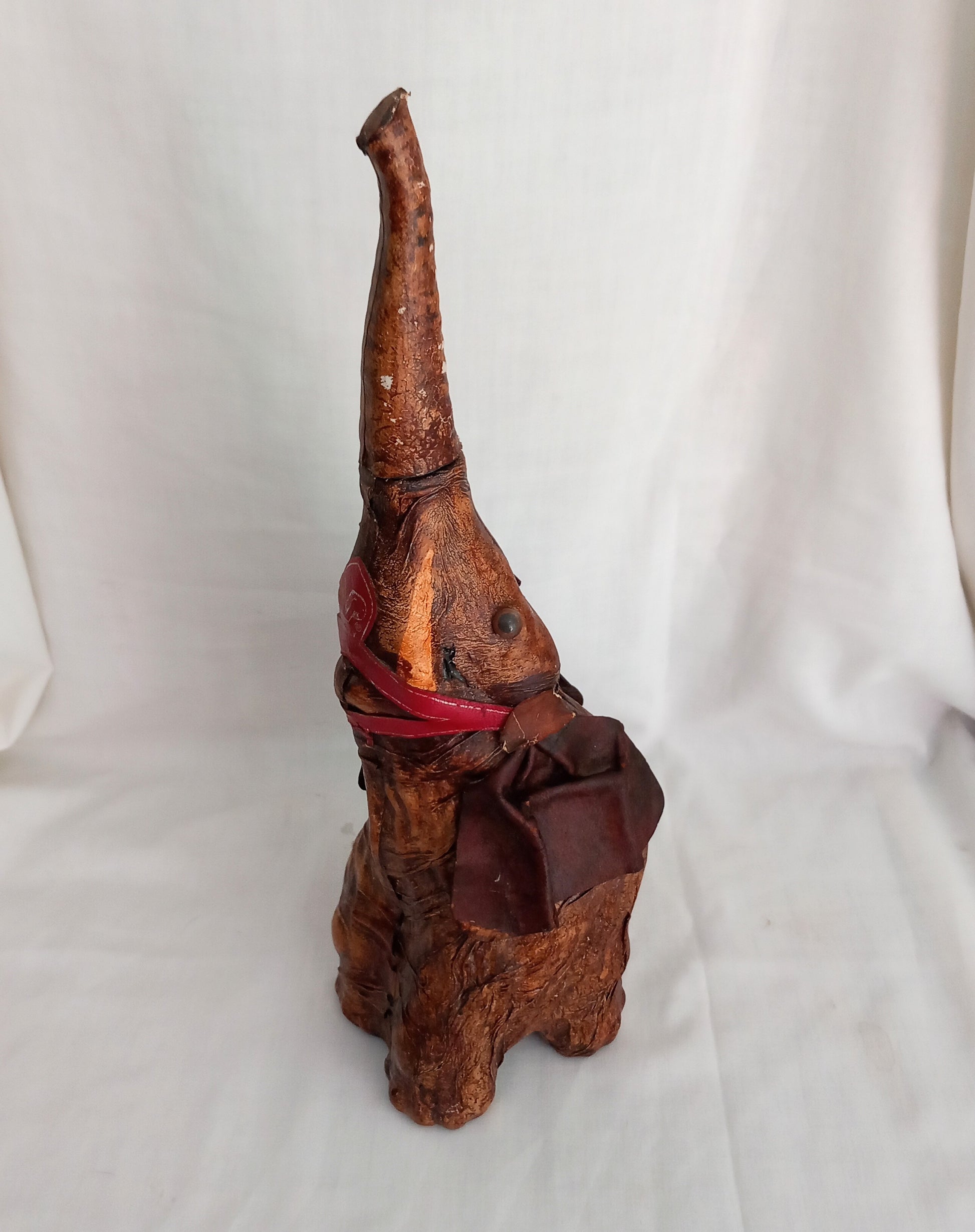 Vintage Vetro Pelle Italian Glass & Brown Leather Elephant Decanter Bottle, 14.5 inches tall. Good vintage condition showing some wear to the leather.