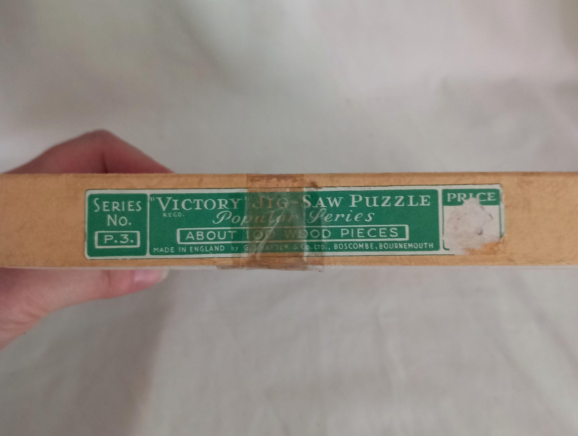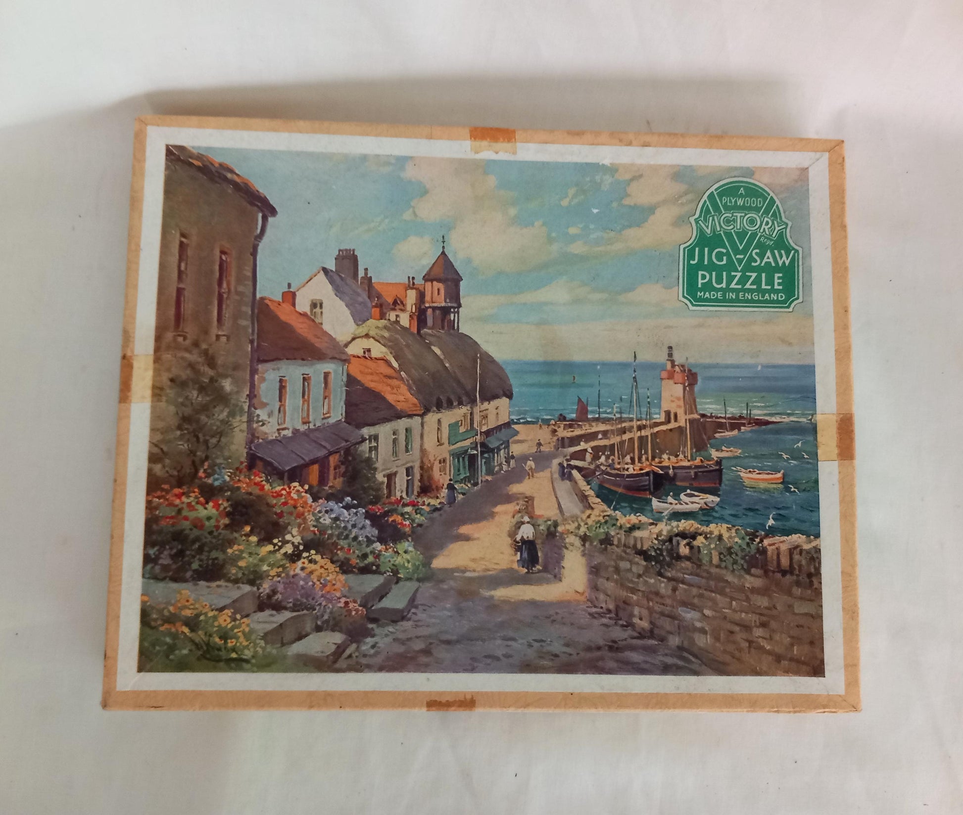 Vintage Victory plywood jigsaw puzzle of a seaside village scene, c1930s/40s. This is 100 pieces and is complete and in good condition, showing a little wear to the box.