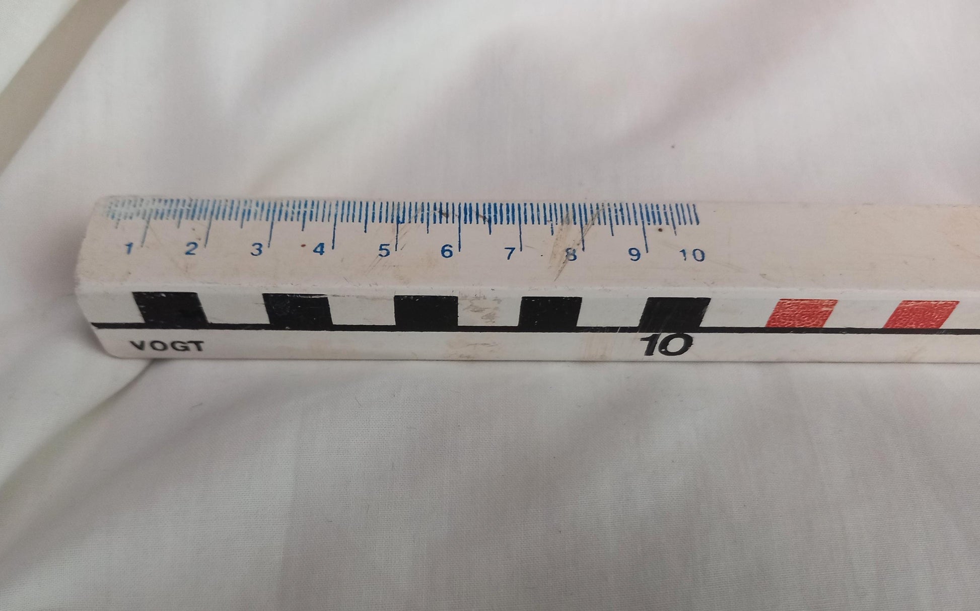 Vintage late 20th century VOGT 1 metre measuring stick with centimetres and feet. Good vintage condition showing wear to the print.
