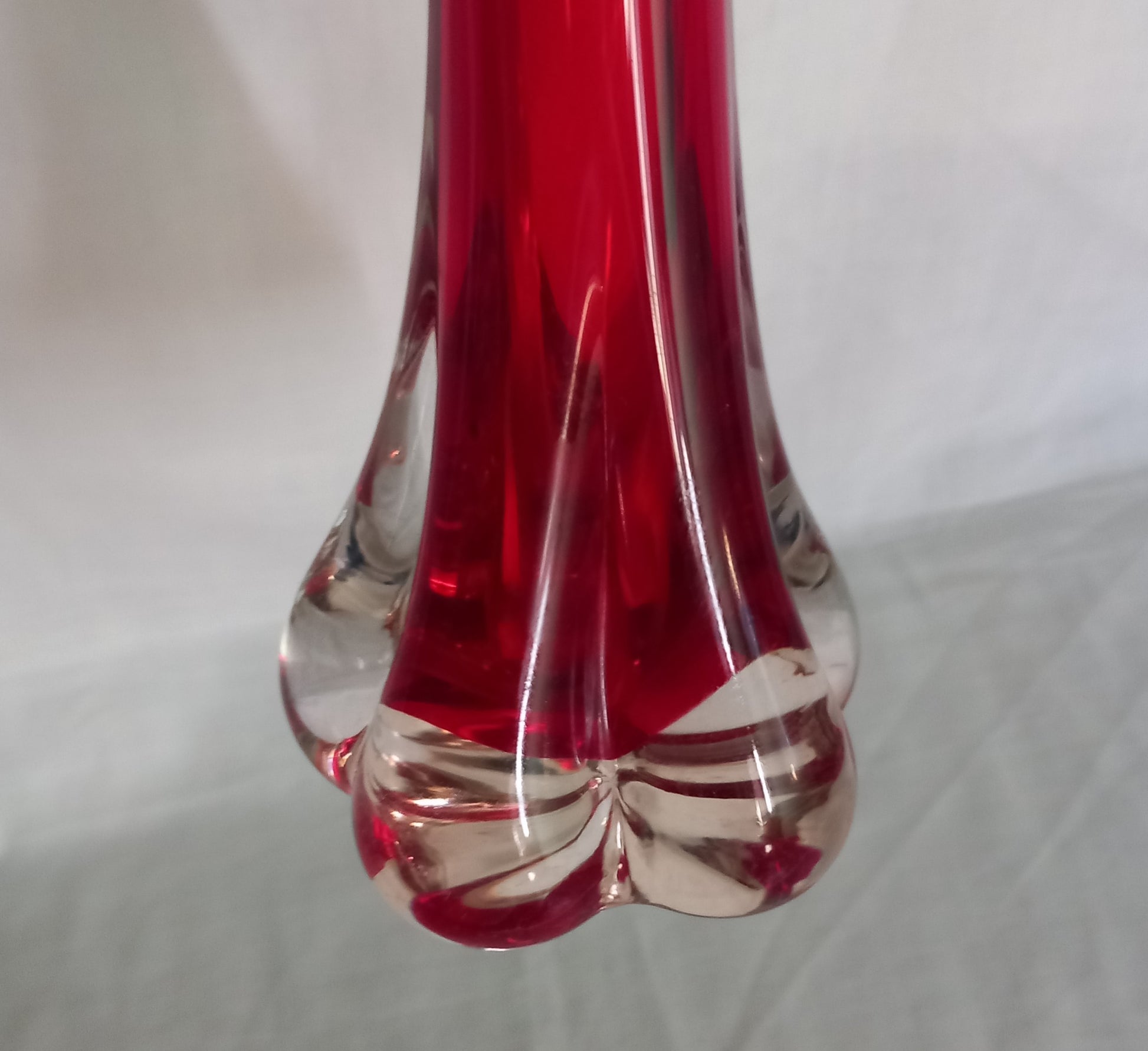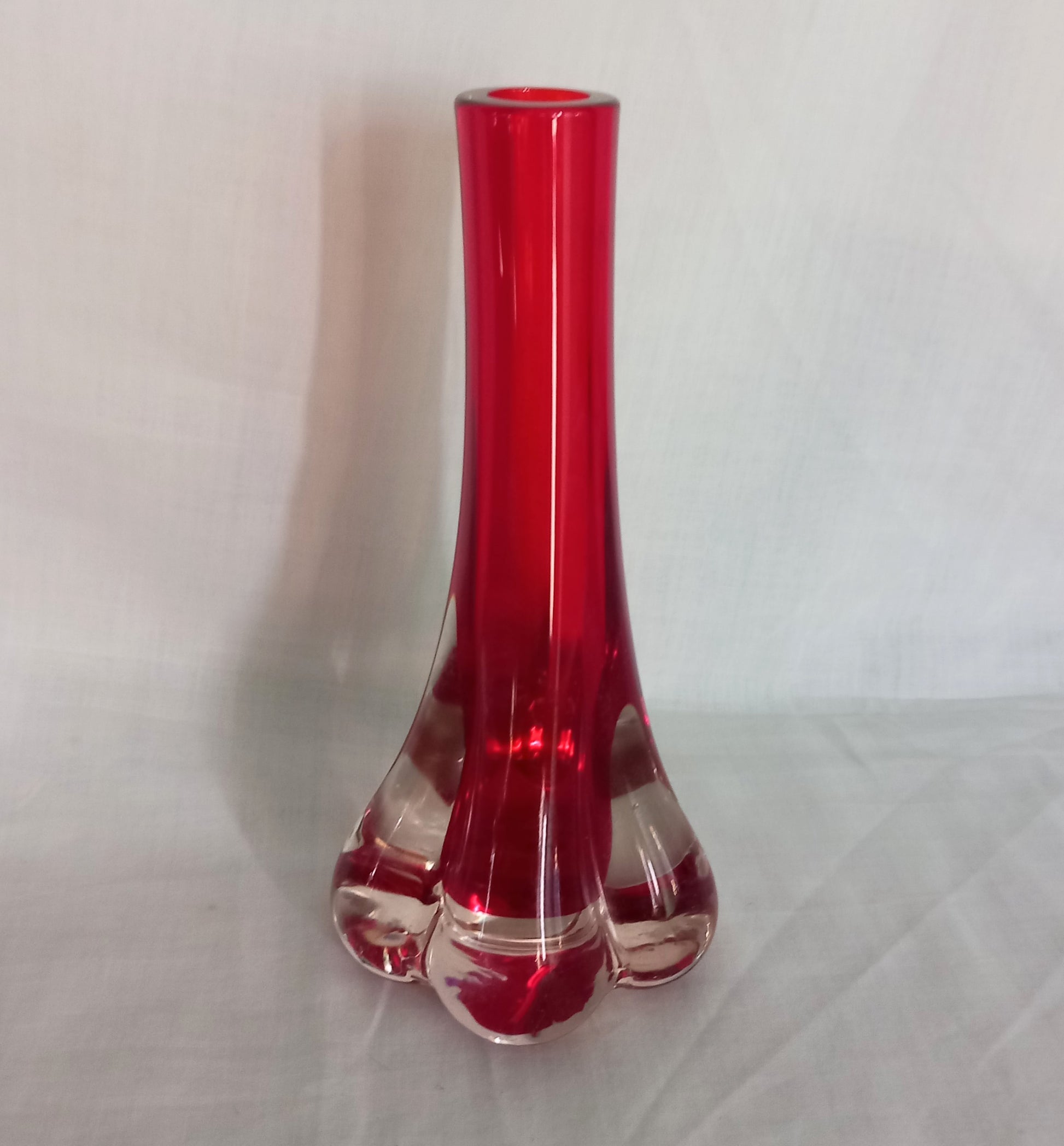 Vintage Whitefriars 9728 ruby red lobed Elephants Foot cased glass vase, 7 inches tall. Good condition with no chips or cracks.