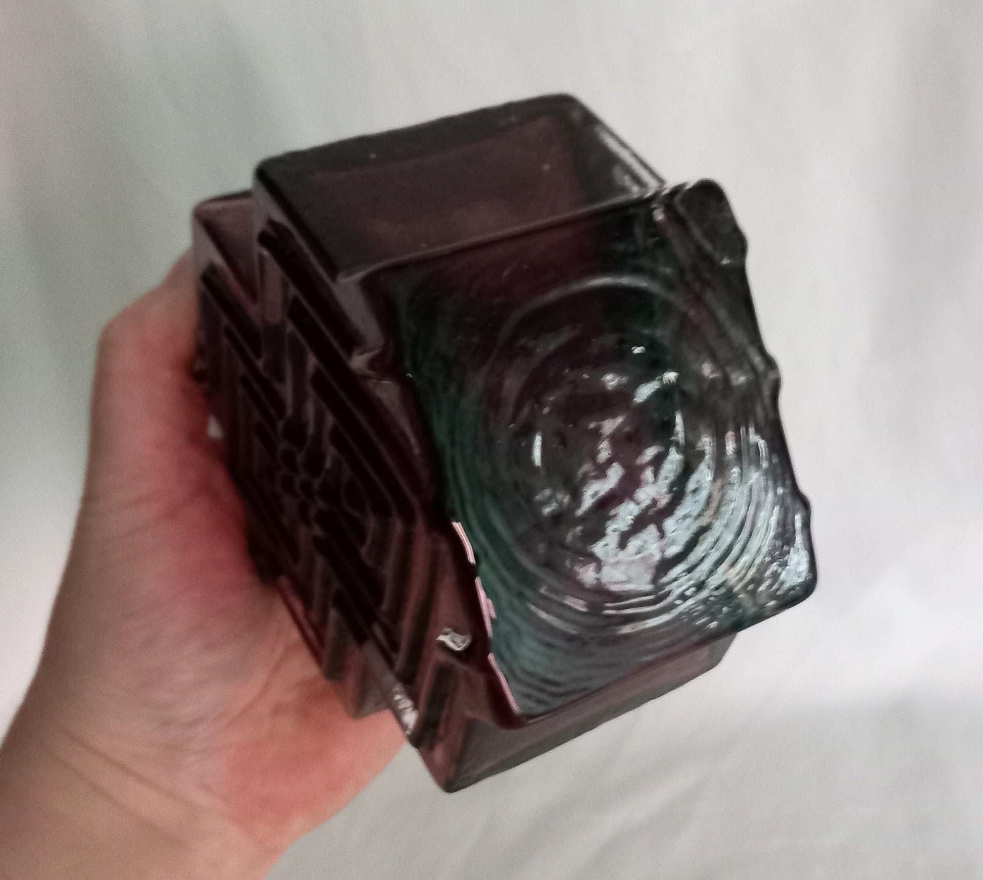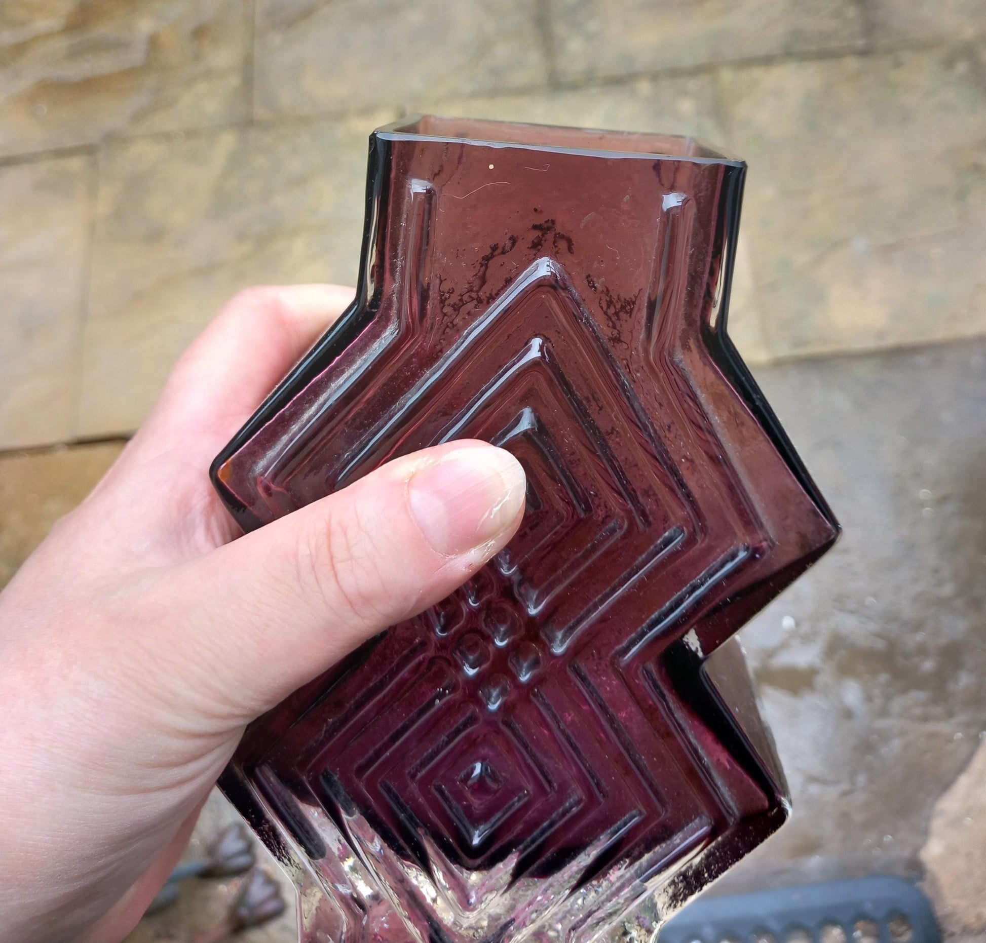 Whitefriars Glass aubergine purple textured Double Diamond vase #9759, 6.5 inches tall. This has 2 very small chips on the rim and a pinpoint fleabite and some staining in the points of the sides.